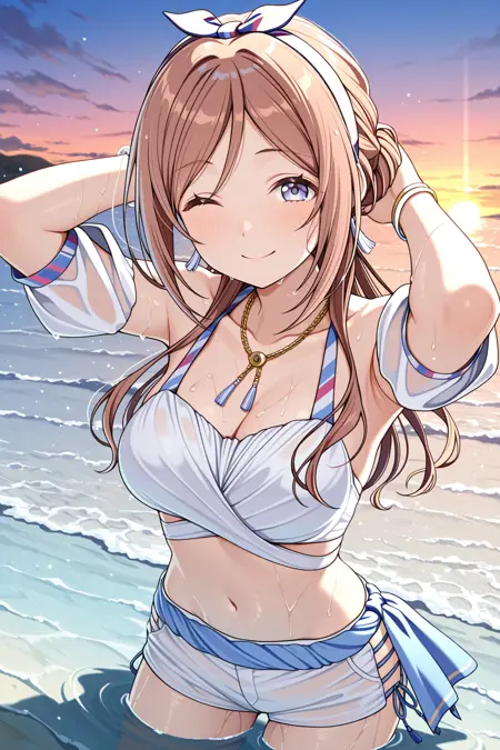 bikini, striped, short detached sleeves, necklace, jewelry, bracelet, white shorts, striped hairband, ribbon hairband