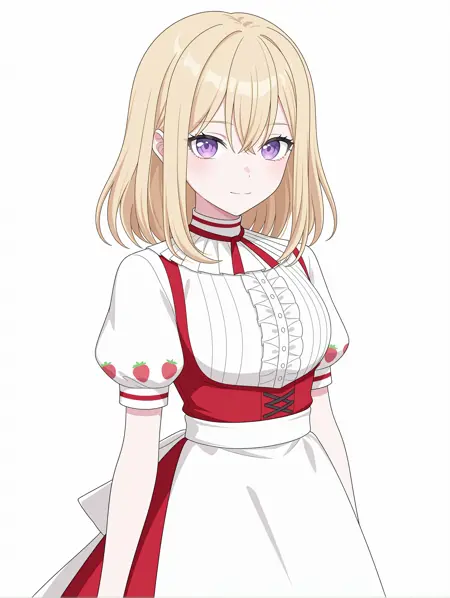 주름진 칼라, 흰 셔츠, 빨간 드레스, 중앙 주름, 볼륨 있는 짧은 소매, 딸기 프린트, 흰 앞치마, 허리 앞치마, 주름진 앞치마, 빨간 부츠, 끈끈한 부츠,