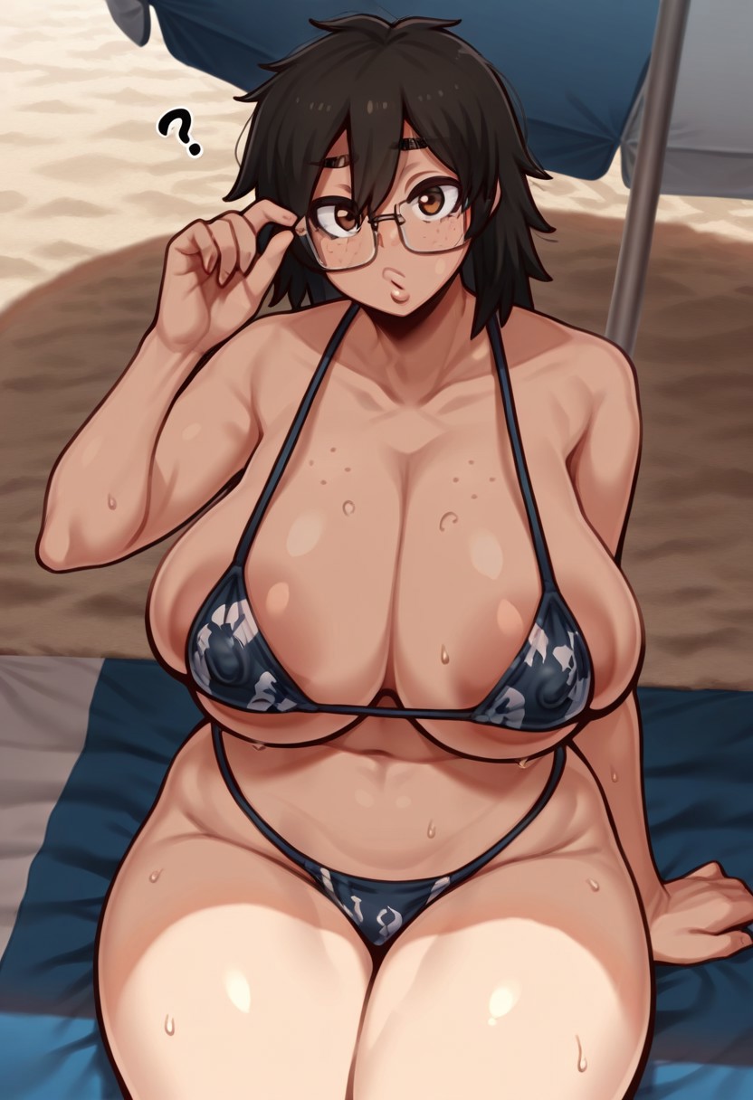 • thick eyebrows, freckles on face, puckered lips, amber eyes, rimless glasses,