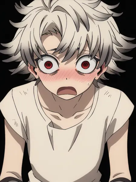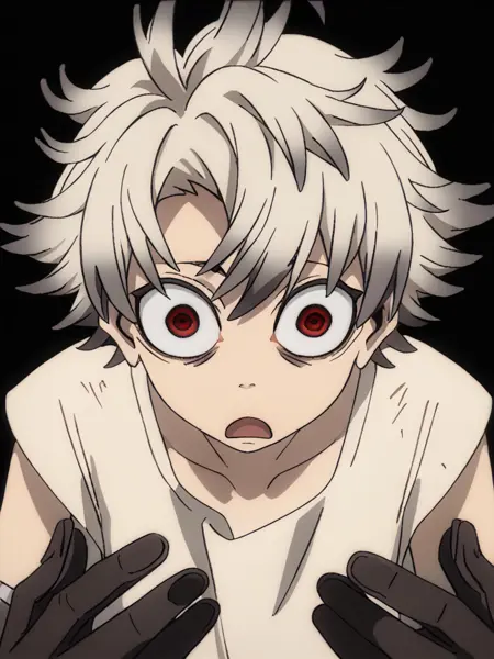 Additional prompt: red eyes, short hair, white hair, grey hair, two-tone hair