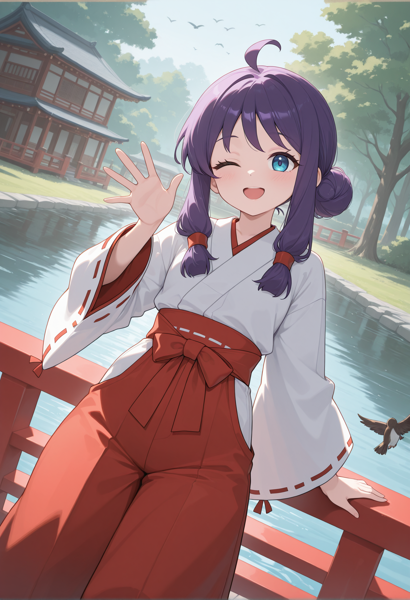 blue eyes,long hair,purple hair,ahoge,twintails,hair bun,