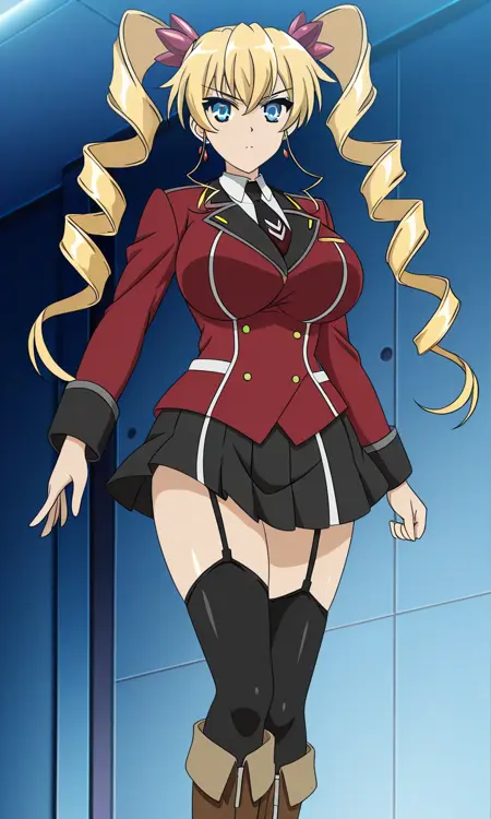 クレア・ハーベイ(ハンドレッド)、ツインテール、ツインドリル、金髪、青い目、イヤリング、大きな胸、太もも、赤いブレザー、黒いネクタイ、シャツ、黒いスカート、プリーツスカート、ガーターストラップ、黒いシンクストッキング、茶色のブーツ