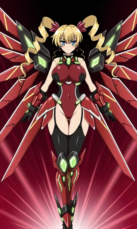 クレア・ハーベイ(ハンドレッド)、ツインテール、ツインドリル、金髪、青い目、イヤリング、大きな胸、太もも、赤いレオタード、赤いボディスーツ、肩出し、太ももカットアウト、手袋、ブレスレット、ブーツ、アーマー、レオタード、ガーターストラップ、メカ娘、赤いレオタード、翼、黒い手袋、ボディスーツ、メカニカルウイング、太ももからお尻が透けて見える、アーマードブーツ、メカニカルブーツ、アーマードグローブ、メカニカルグローブ