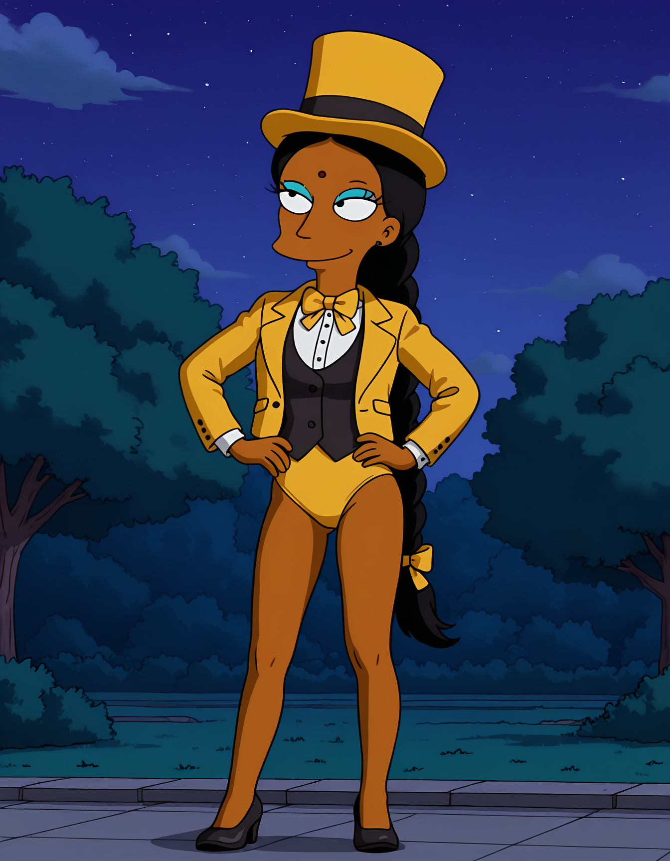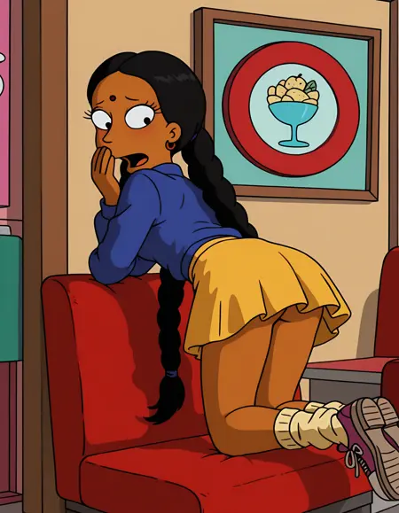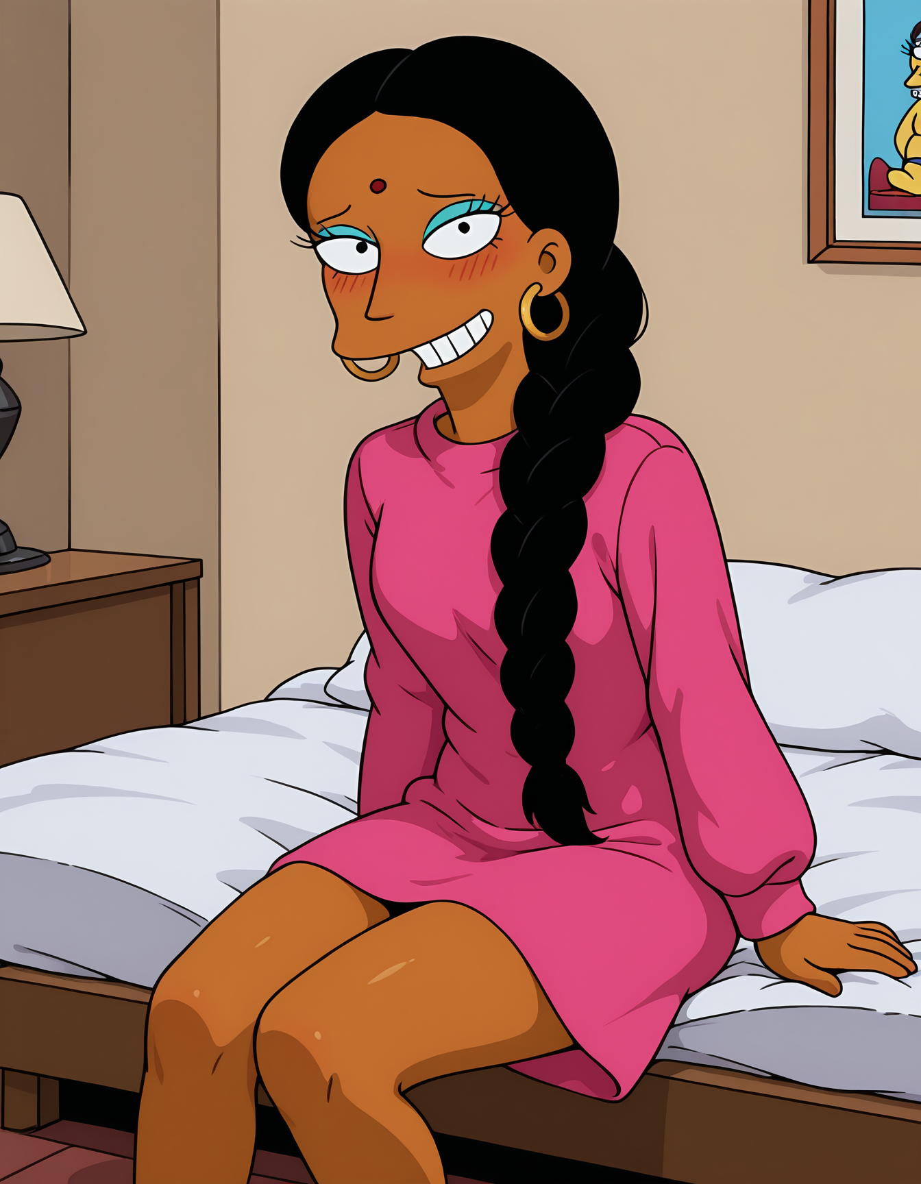 manjulasimpsons, parody, style parody, simpsons style, black hair, single braid, dark-skinned female, aqua eyeshadow, red bindi, black eyes, hoop earrings