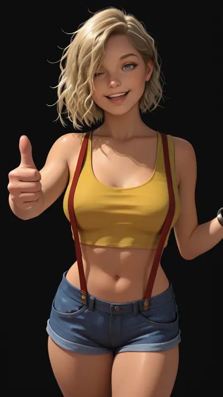 黄色短款背心,红色背带,牛仔短裤,卷边短裤