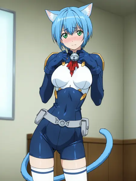 cpc-melwin, 水晶蓝眼睛, 蓝发, 短发, 发丝遮眼, 猫耳, 猫尾, 颈部铃铛, 项圈, 领结