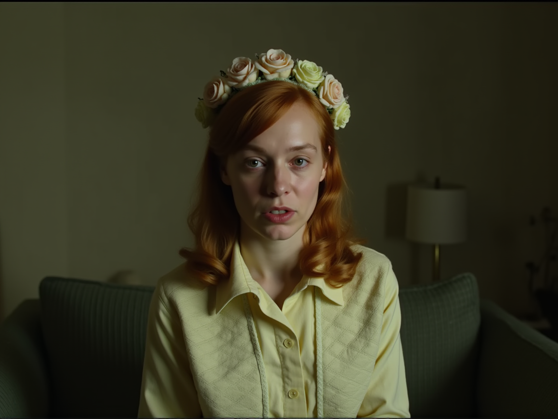 F1nch3r 1970s photo, A redheaded woman sitting on a couch in a dimly lit room, wearing a crown of pale roses and light-colored shirt with a quilted pattern.