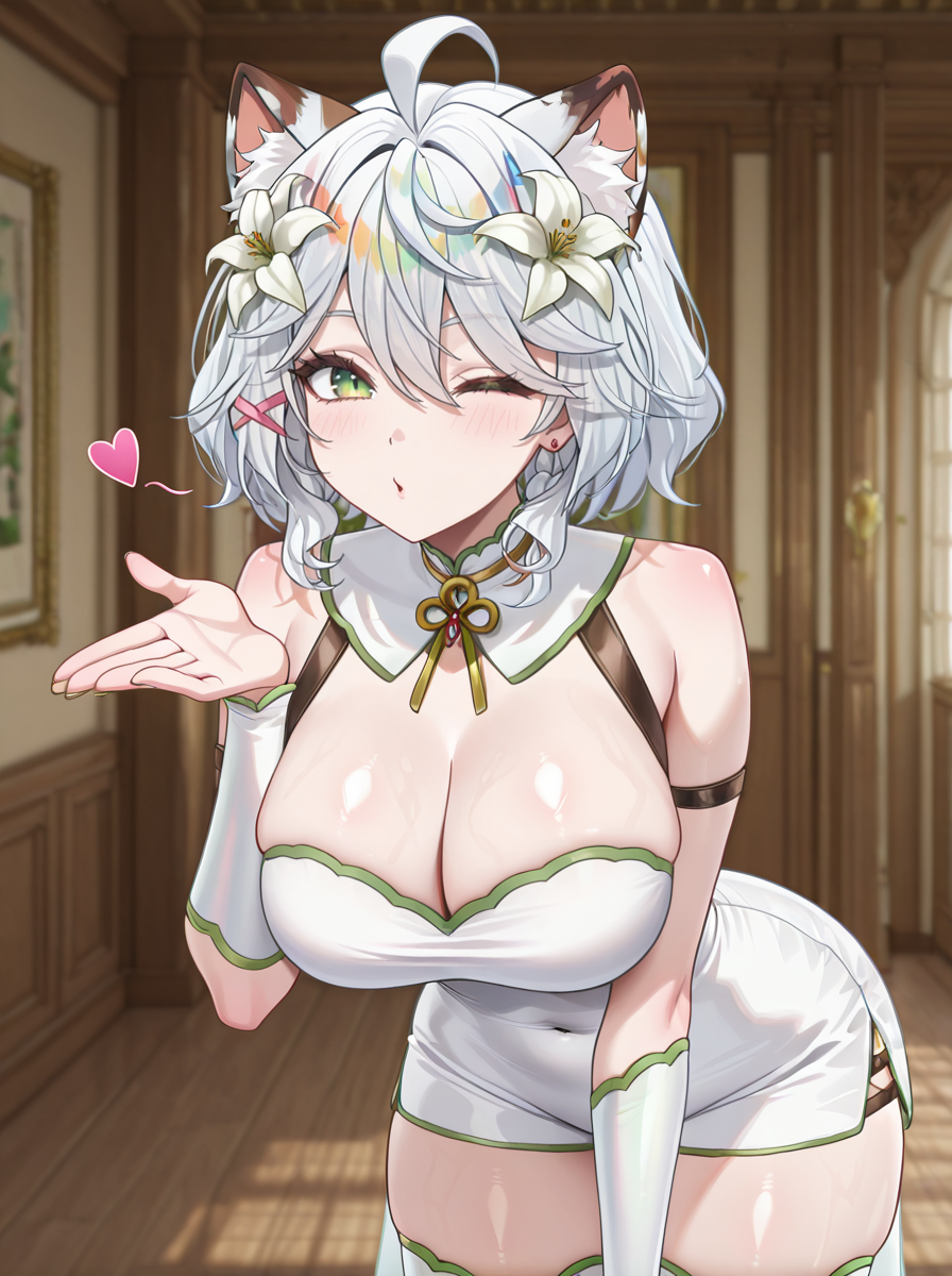 base look: 1girl, solo, green eyes, breasts, hair ornament, lillialuminariadefault, animal ears, flower, cleavage, thighhighs, hair flower, short hair, ahoge large breasts,