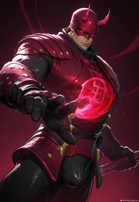 DAR3D3VIL, Samurai armor, red gauntlets, boots, kneepads, red boots, helmet, horns, black bodysuit, red amor,