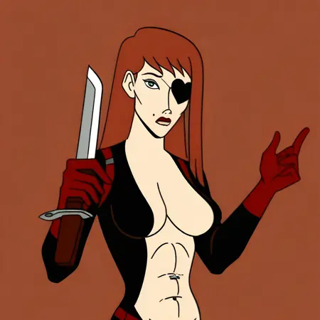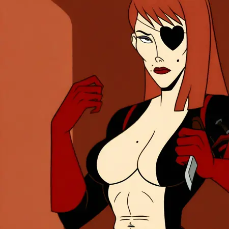 MCTVB, 1girl, solo, long red hair, straight hair, green eyes, heart eyepatch, beauty mark,