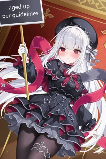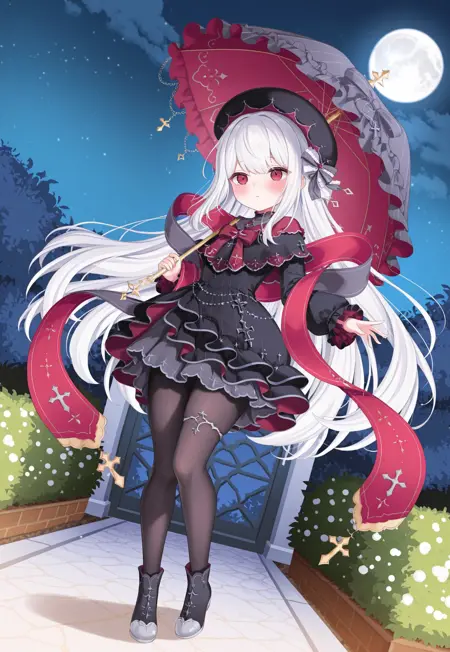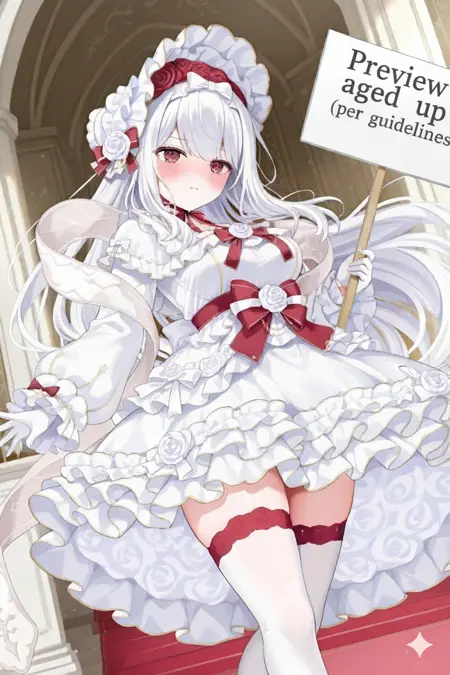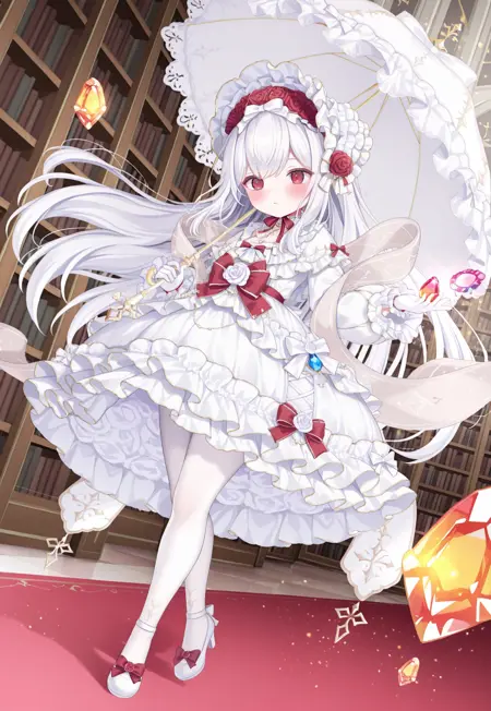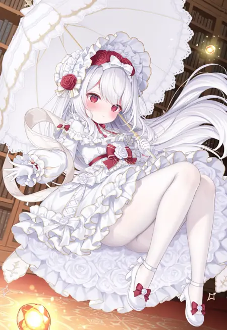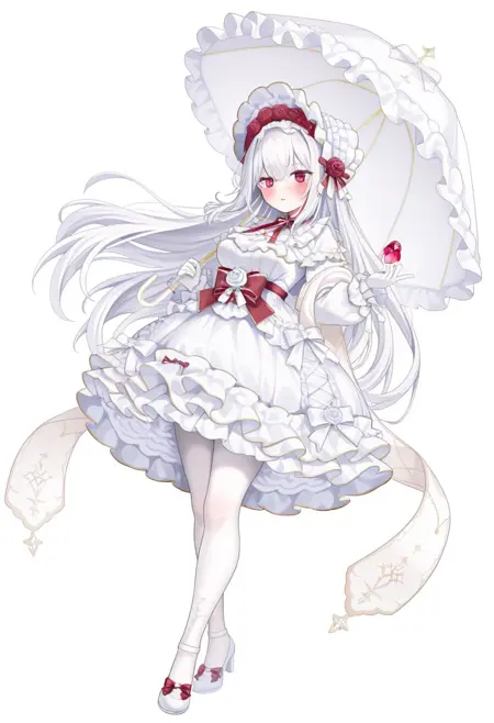 frilled bonnet,bow hairband,white hairband,white dress,frilled dress,bow,red bow,white bow,long sleeves,frilled sleeves,white gloves,frilled gloves,white thighhighs,flower frilled thighhighs,red flower,white flower,rose,white shoes,mary janes,high heels,