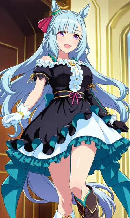 영광스러운 청록색, 공식 대체 복장, 오픈 옷, 오픈 자켓, 날개형 칼라, 파란 자켓, 크롭 자켓, 풍성한 짧은 소매, 파란 짧은 넥타이, 흰 셔츠, 아랫가슴, 단추, 더블 브레스티드, 흰 장갑, 금장식, 뒤쪽 노란 활, 벨트, 말굽 장식, 빨간 활, 무릎 부츠 밑 흰 허벅지 양말, 하이힐 부츠, 흰 신발, 스커트, 허리 높은 파란 스커트,