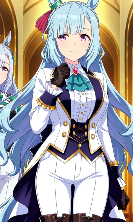 영광스러운 청록색, 공식 대체 복장, 오픈 옷, 오픈 자켓, 날개형 칼라, 파란 자켓, 크롭 자켓, 풍성한 짧은 소매, 파란 짧은 넥타이, 흰 셔츠, 아랫가슴, 단추, 더블 브레스티드, 흰 장갑, 금장식, 뒤쪽 노란 활, 벨트, 말굽 장식, 빨간 활, 무릎 부츠 밑 흰 허벅지 양말, 하이힐 부츠, 흰 신발, 허리 높은 파란 스커트, 반바지, 흰 반바지,