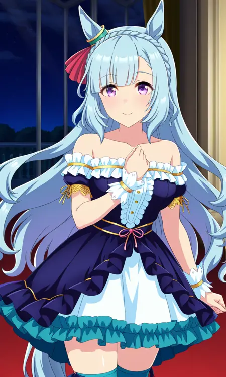 대체 복장 부츠활 활 스커트 뜯은 머리 말굽 장식 목걸이 가슴 코르셋짧은 자켓 왕관 땋은 머리 크롭 탑 기타 끈 자켓 허리배꼽공식 대체 복장 펜던트 목걸이 보라색 목걸이 보라색 기타 끈 보라색 허벅지 양말 빨간 반바지 빨간 코르셋 리본 반바지 별(기호) 별 프린트 스타팅 퓨처(우마무스메) 정면 허벅지 양말 허벅지부츠 밑 허벅지 양말 흰 자켓 손목 밴드 흰 부츠