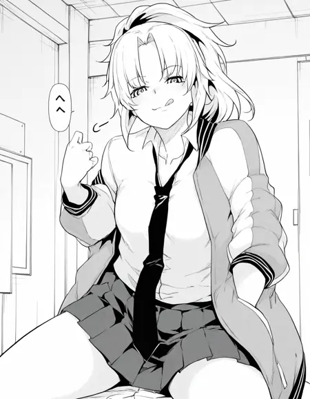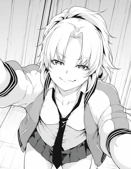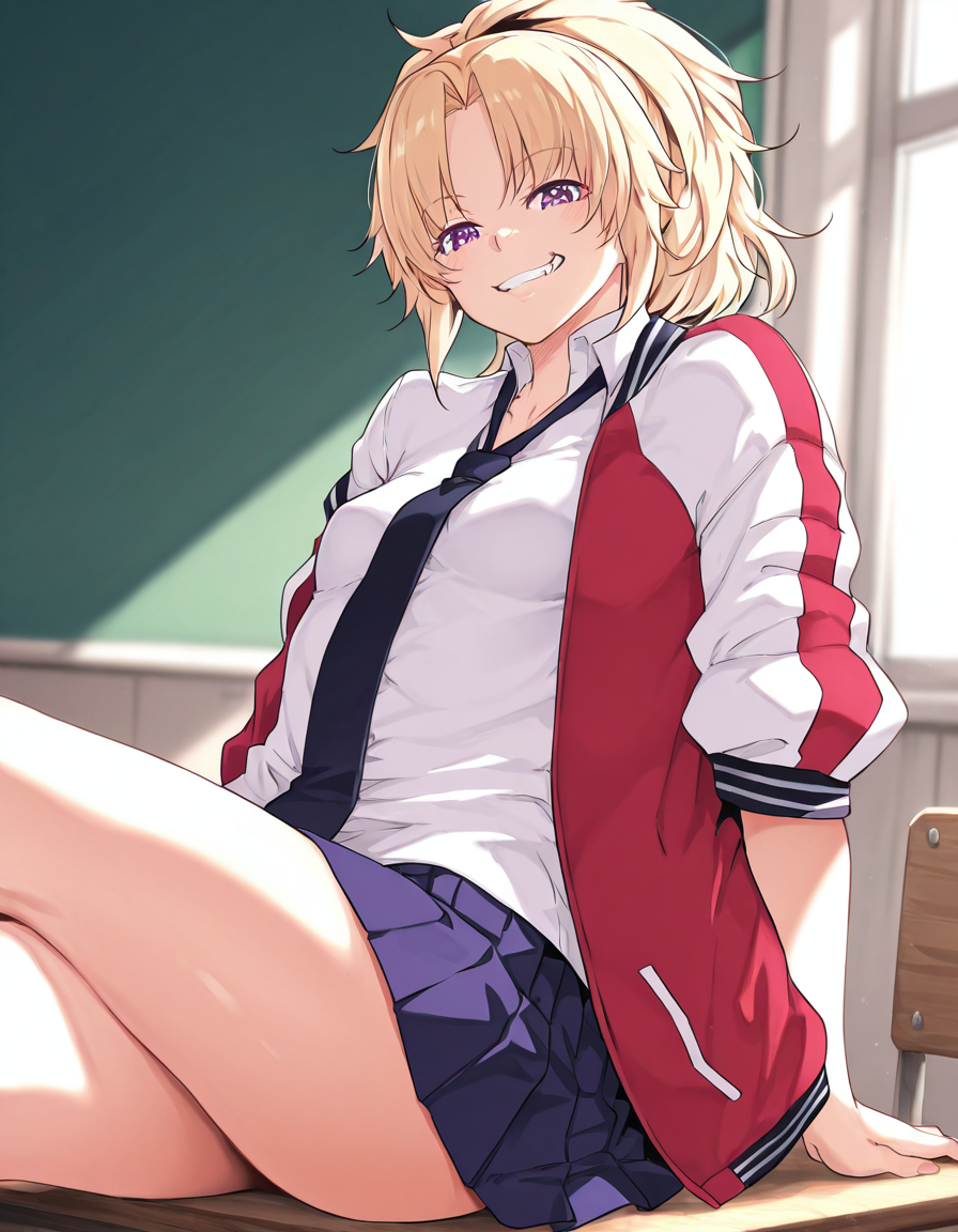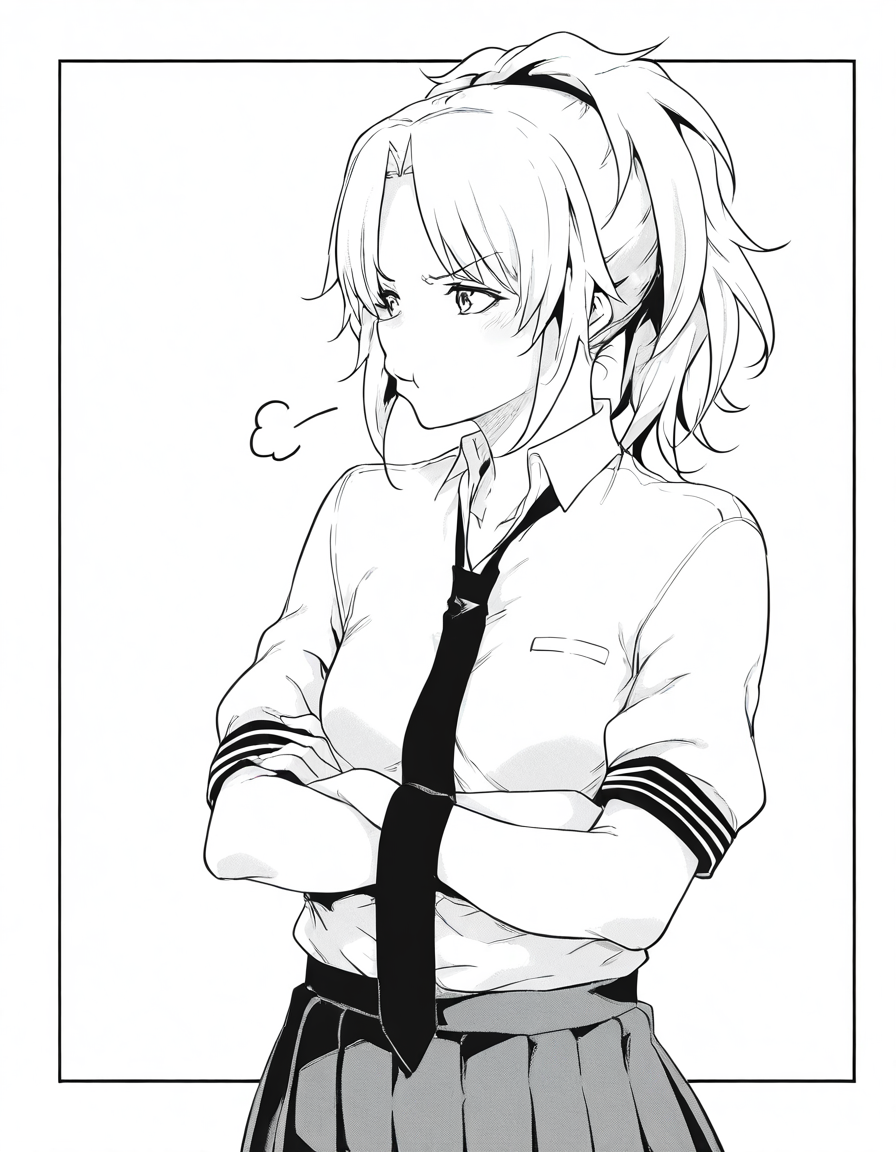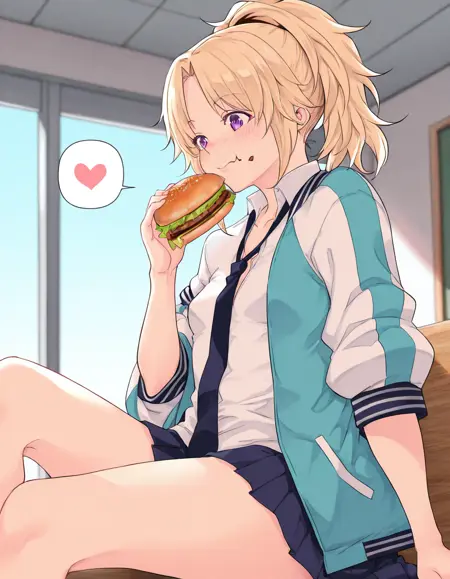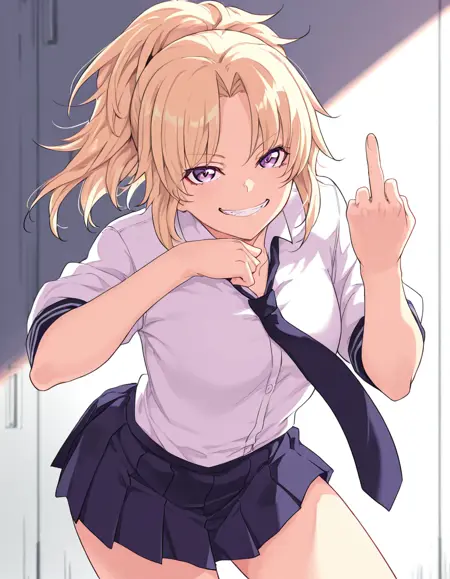 Trained prompts: 1girl, kiwaminirisawa, nirarebachan, messy hair, parted bangs, high ponytail, school uniform, tie, pleated skirt, small breasts, jacket, jacket off shoulder, blond hair, purple eyes