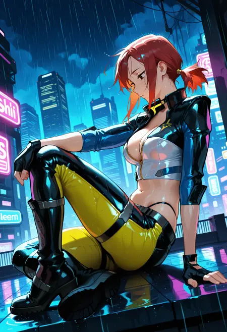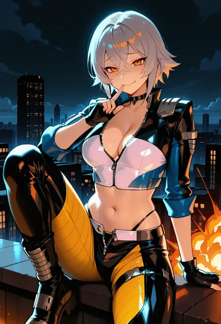 트리거 단어: 가죽 의상, 재킷, 컷아웃 재킷, 다색 재킷, 검정 재킷, 흰색 재킷, 파란색 재킷, 바지, 다색 바지, 검정 바지, 노란색 바지, 하이부츠, 타이스트랩, 손가락 없는 장갑, 허벅지 스트랩,