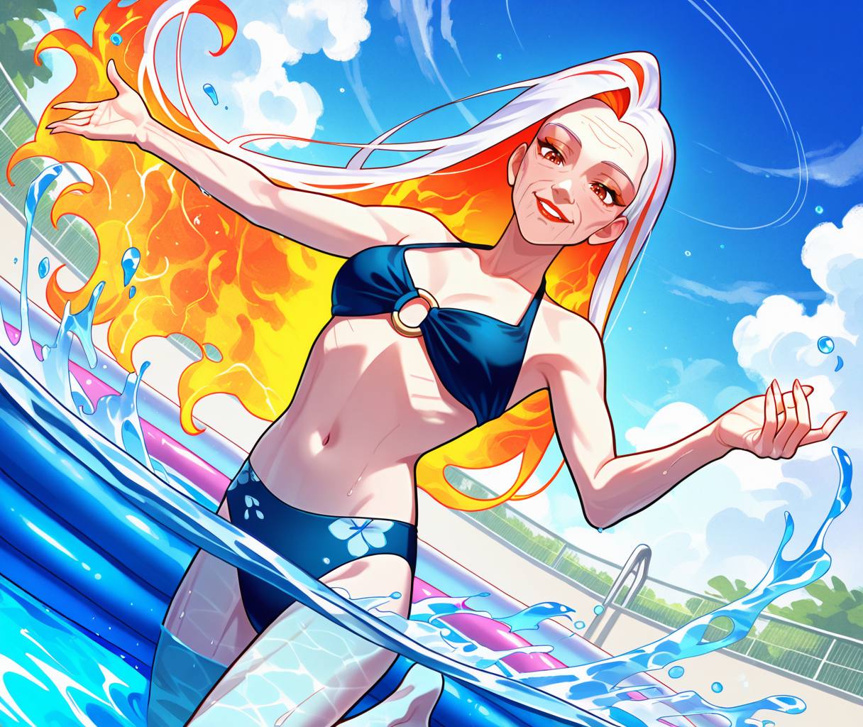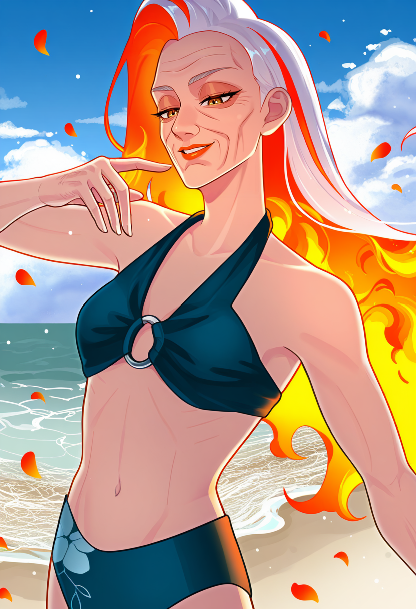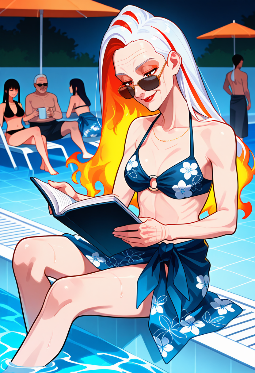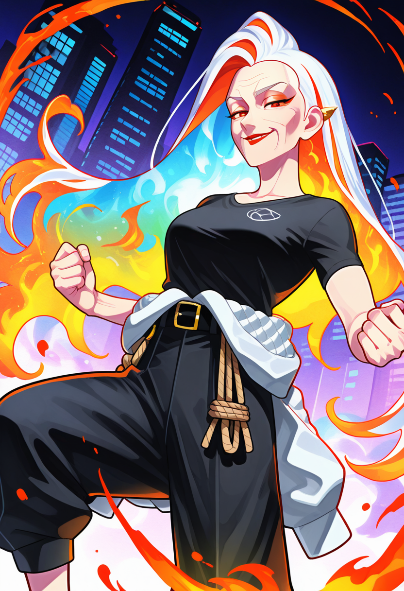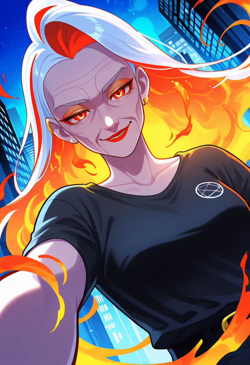 1. tasc1nd3r3ll4, old woman:0.5, 1girl, white_long_hair, red_streaked_hair, colored_inner_hair, fiery_hair, red_lips, orange_eyeshadow, makeup, solo,