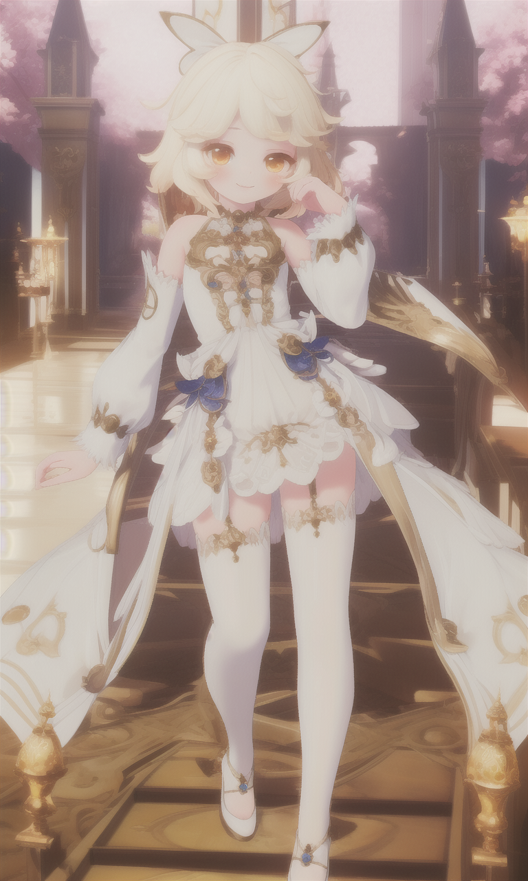 1소녀, 연희, 짧은 흰색 드레스, 분리형 소매, 허벅지 스타킹, 리본, 프릴, 보석, 우아함, 액세서리, 서 있는 자세, 초세부, 걸작