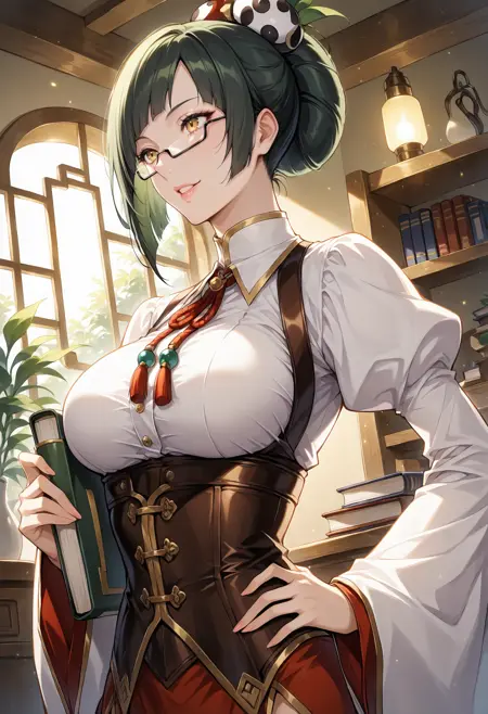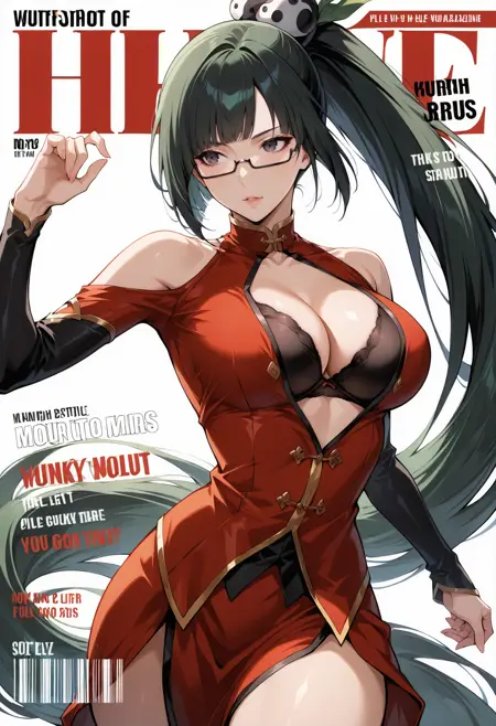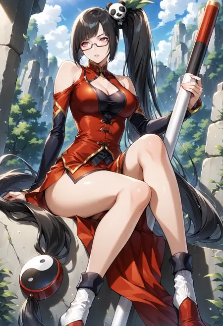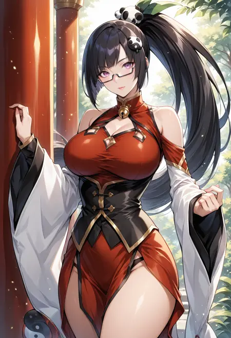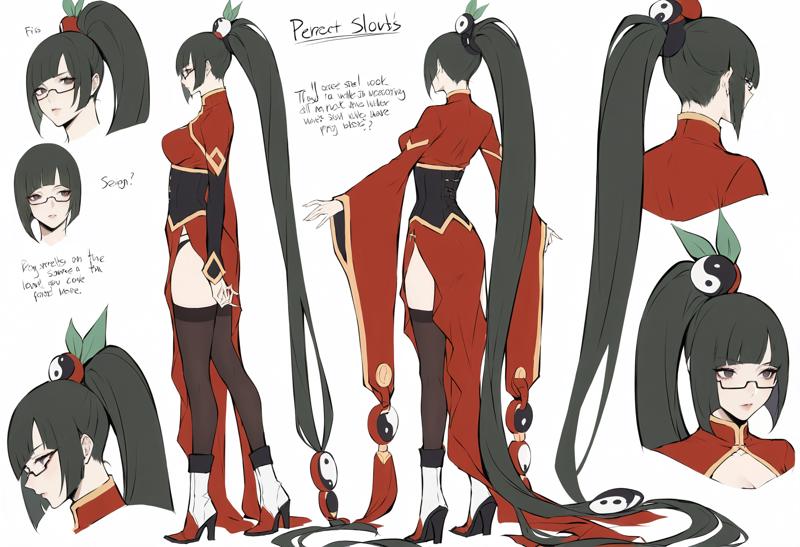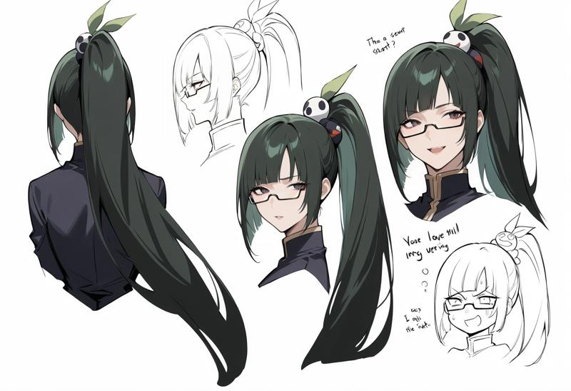 Appearance: 1girl,glasses,semi-rimless eyewear,under-rim eyewear,red eyes,purple eyes,black eyes,black hair,ponytail,long hair,green hair,very long hair,absurdly long hair,bangs,blunt bangs,hair ornament