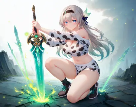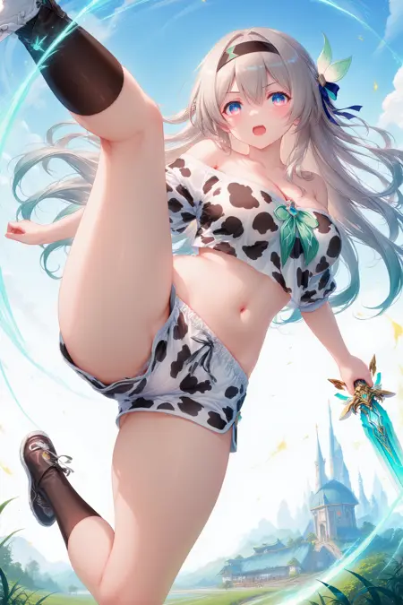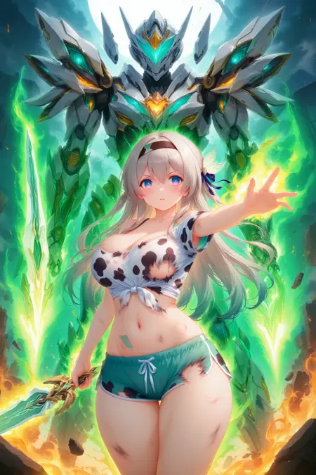 1girl,solo,firefly from honKai starrail,large breasts,thick thighs,cow-print dolphin shorts,cow-print crop top,cleavage,off shoulder,midriff。画面描绘了她因战斗导致的衣服破损和脏污,她正面漂浮在半空中,她的正后方是名为SAM的铠甲(机器人,SAM from honkai starrail),她的身上燃起萤绿色的火焰,摆出变身姿势,和她身后的铠甲组装合体