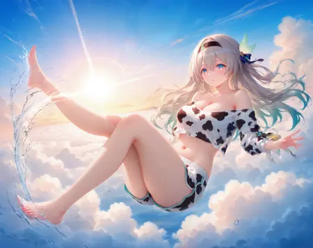<Attributes>Both characters are depicted with large breasts, thick thighs, prominent cleavage, and exposed midriffs. They are dressed in matching cow-print dolphin shorts and cow-print off-shoulder crop tops.</Attributes>