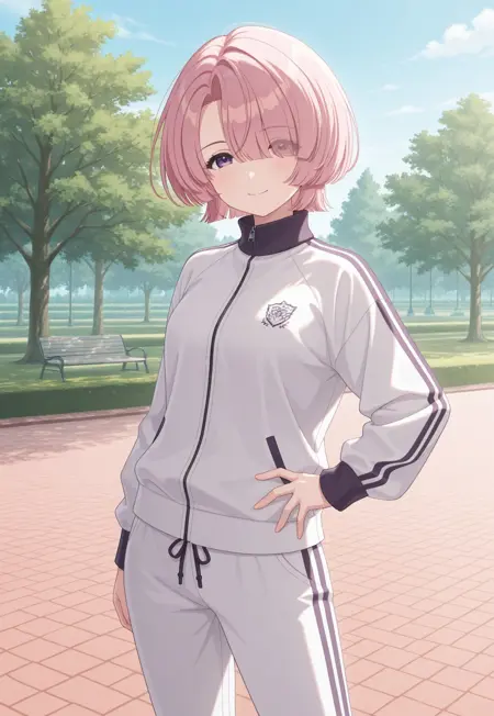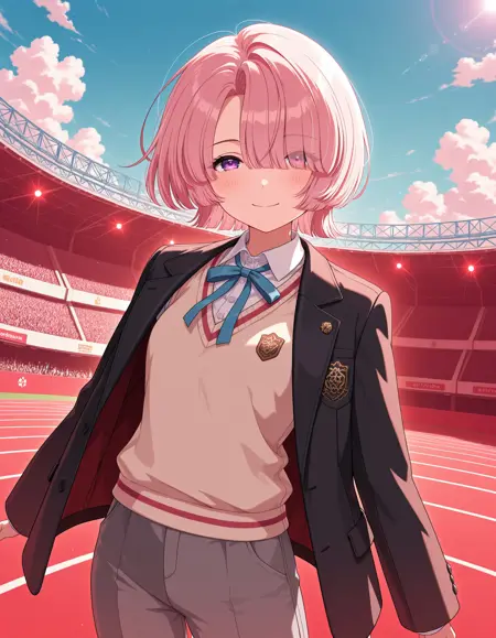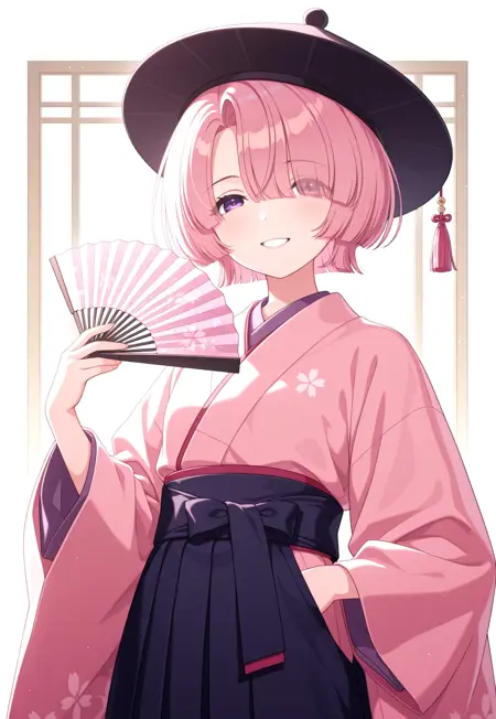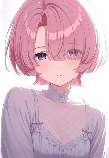 1girl, solo, pink hair, short hair, bangs, purple eyes