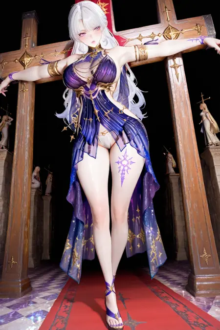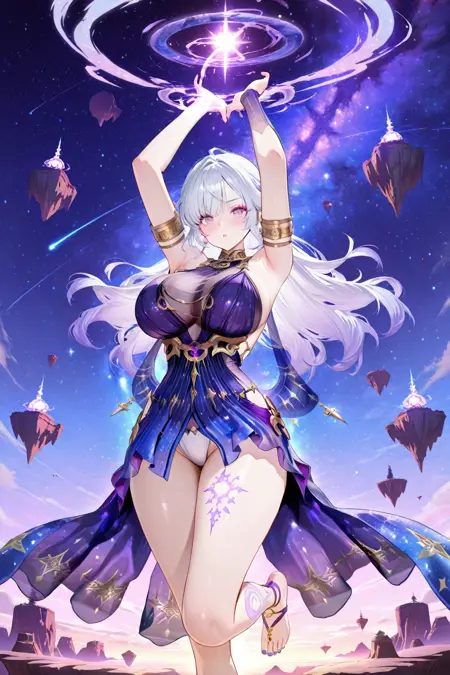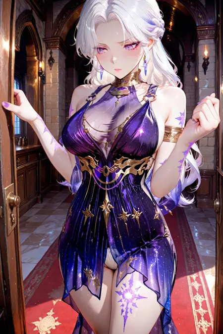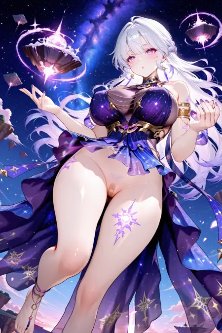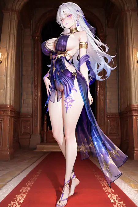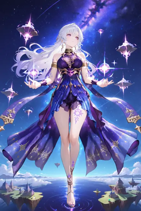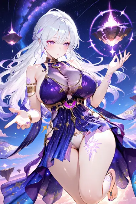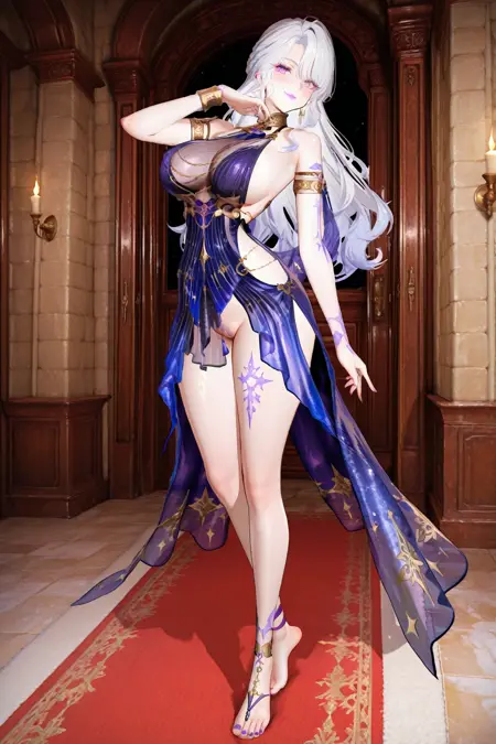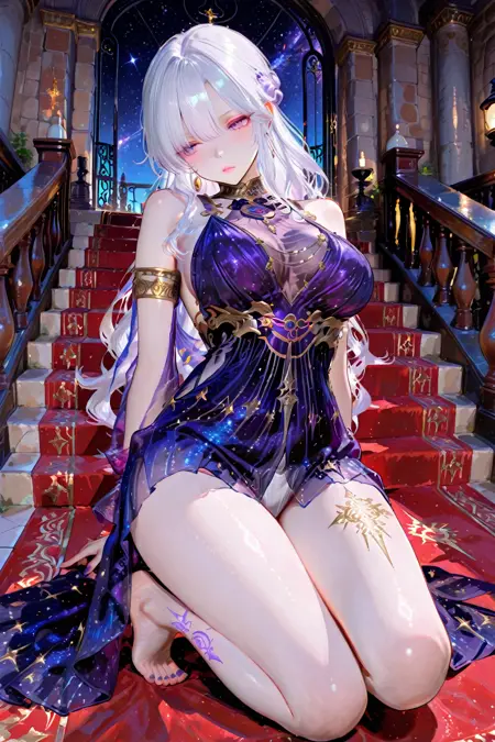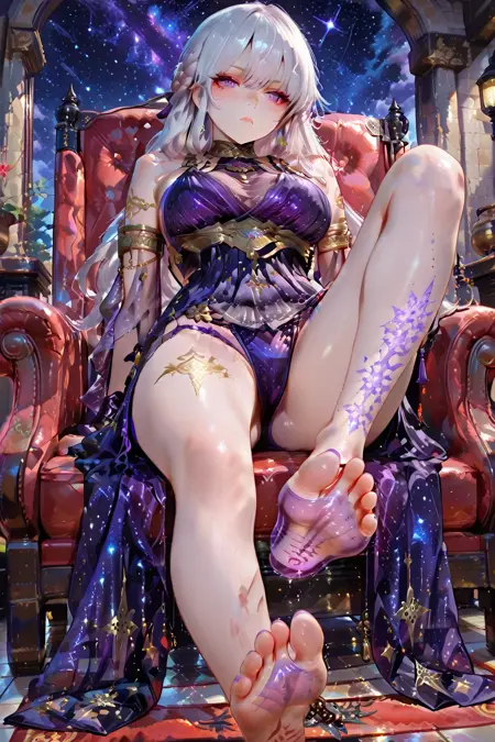 purple dress,armlet,chain,gradient dress,barefoot,leg tattoo,see-through,starry sky print,