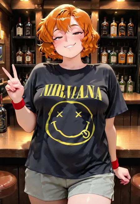 audrey, 1girl, chubby, ginger hair, brown eyes, freckles, chin length hair, short hair, wavy hair, black shirt, big boobs, thick thighs