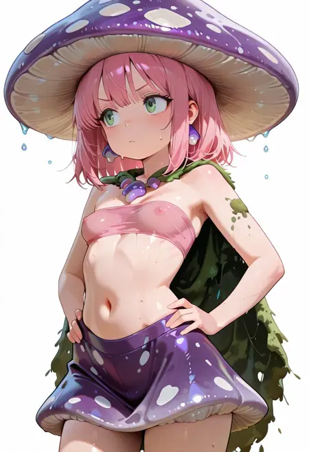 | Trained Words | 1girl:(pink hair, green eyes, medium hair, small breasts, navel, bare shoulders, strapless, sleeveless ))Copied! (girl clothes :(purple mushroom hat, purple mushroom skirt, pink mushroom top, tube top, mushrooms with white spots, moss cape, short cape, purple mushroom necklace, purple mushroom earings, (nipples that show through clothing))),Copied! |