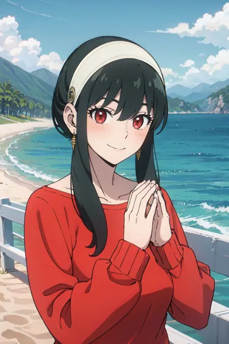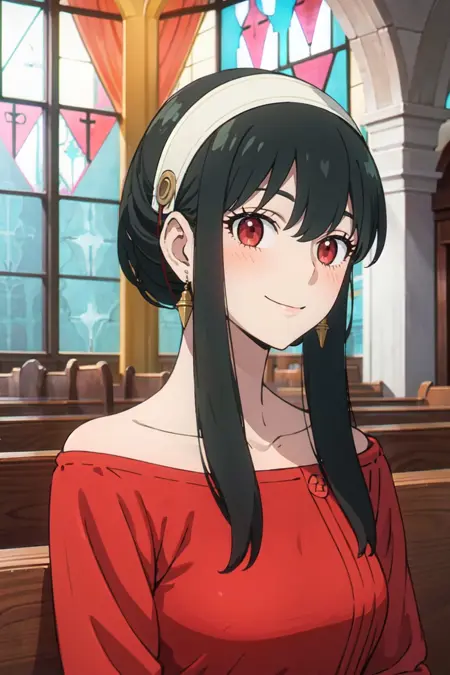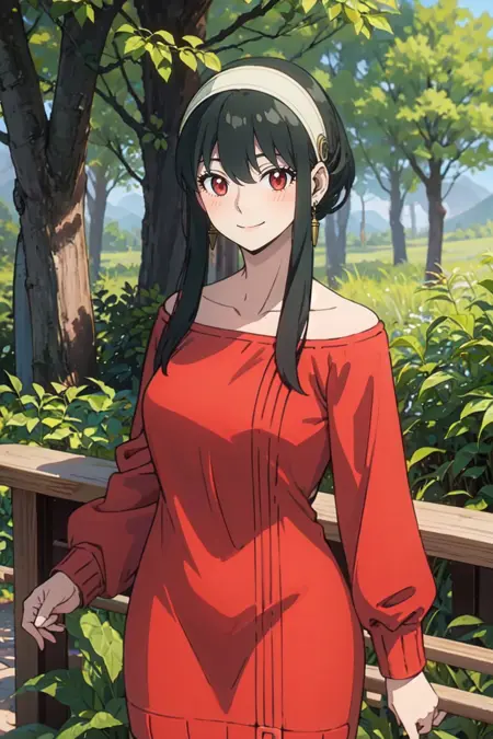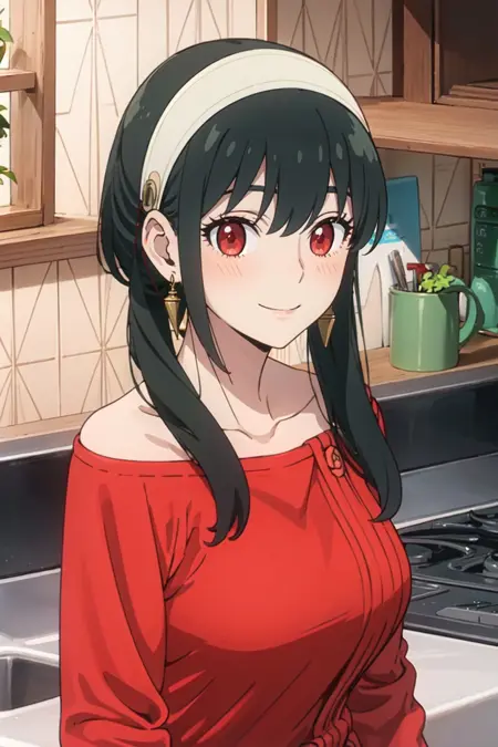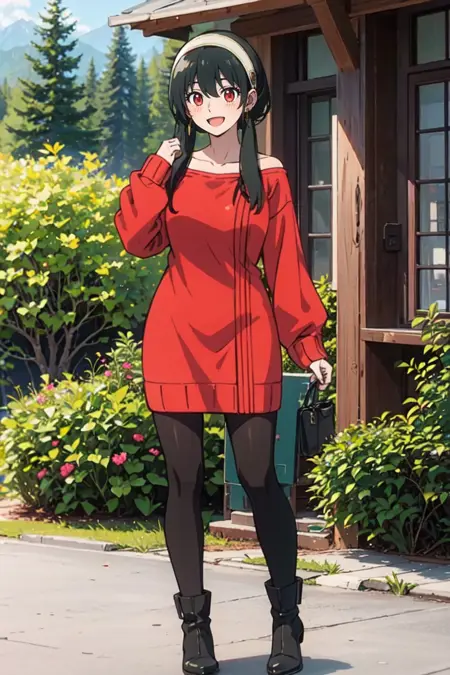 For her original outfit use the tags: pikkyyor, 1girl, solo, looking at viewer, black hair, sidelocks, bangs, long hair, short hair with long locks, red eyes, breasts, large breasts, white hairband, earrings, pantyhose, hairband, sweater, red sweater, sweater dress, black pantyhose, dress, jewelry, off shoulder, collarbone, off-shoulder sweater, long sleeves