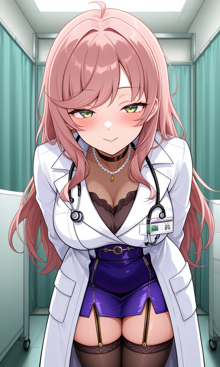 h1naadult, long hair, swept bangs, choker, white coat, labcoat, shirt, see-through, bead necklace, stethoscope, purple skirt, pencil skirt, garter straps, black thighhighs🐑第四套服装(Roomwear):
