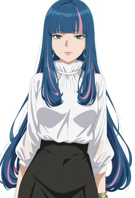 ei2da, long hair, multicolored hair, green eyes, blue hair, bangs, pink hair, blunt bangs, mole under eyes