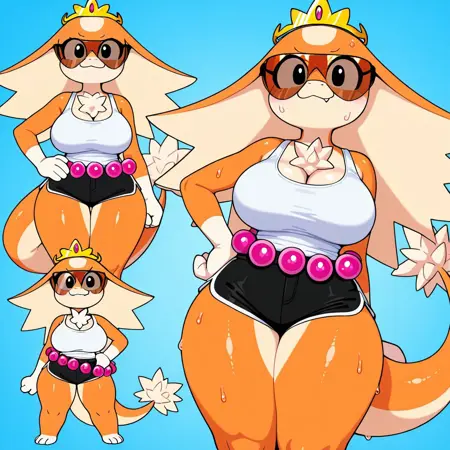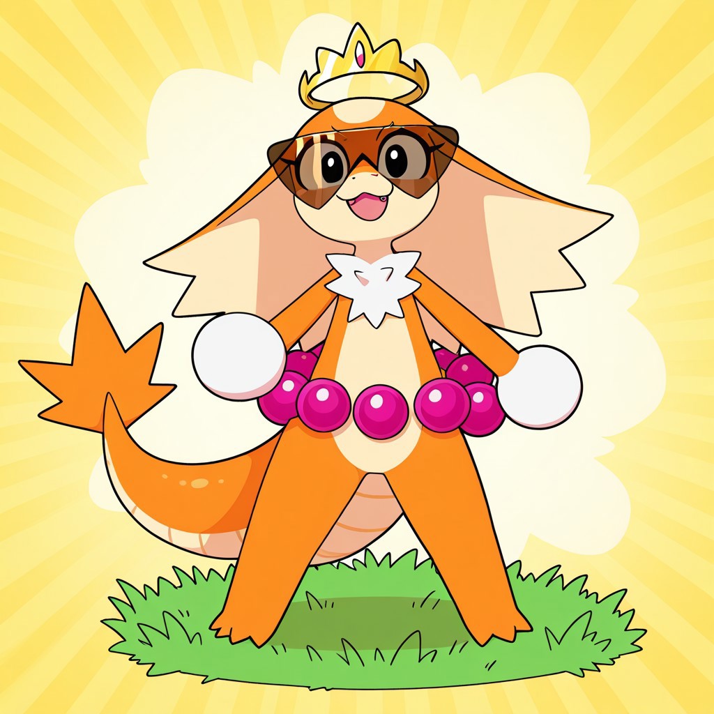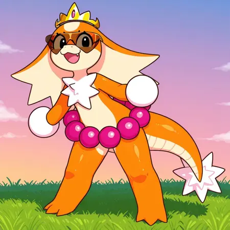 reptile, cobra, snake girl, orange scales, snake hood, black eyes, star-shaped chest fur, snake tail, fluffy tail tip, fang, round hands, sunglasses, gold tiara, pink orbs,