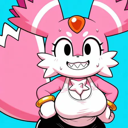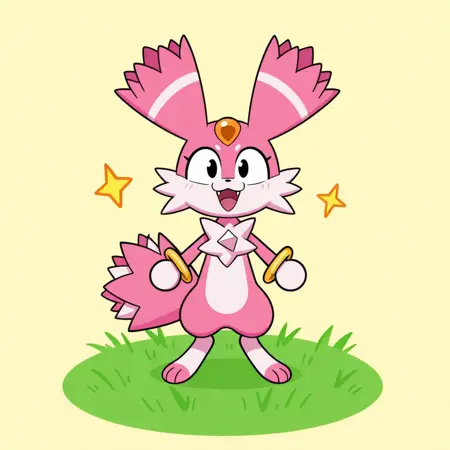 female furry, pink and white fur, black eyes, black nose, orange forehead jewel, large ears, star-shaped chest fur, spikey tail, plantigrade, round hands,