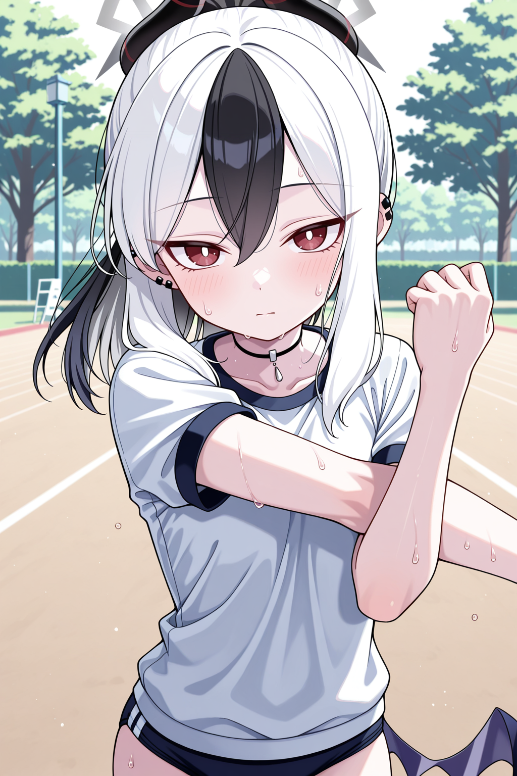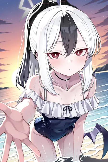 kayokodef, 长发, 侧发, 白瞳, 马尾, 多色发, 双色发, 白发, 黑发, 耳钉, 灰色光环, 角, 恶魔角, 翅膀, 恶魔翅膀, 单翼, 红眼, kayoko(蓝色档案)