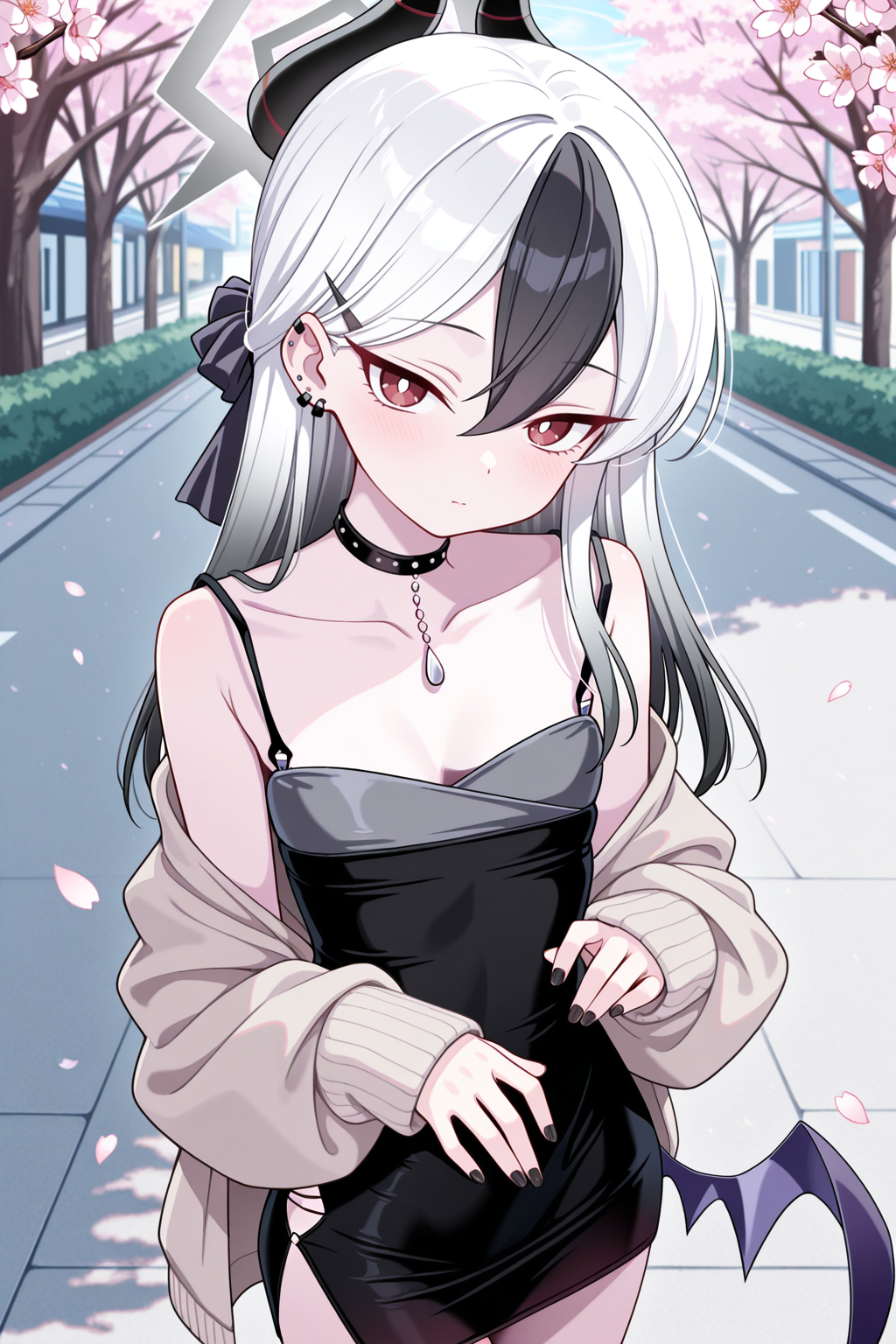 kayokodress, 黑发, 白发, 多色发, 双色发, 长发, 白瞳, 直发, 发丝间于眉间, 单侧发, 头发蝴蝶结, 黑色蝴蝶结, 长袖, 蓬松袖, 蓬松长袖, 灰色毛衣, 开襟服装, 铅笔裙, 黑色裙子, 短裙, 无袖裙, 露肩, 黑色指甲, 指甲油, 红眼, 恶魔角, 灰色光环, 翅膀, 恶魔翅膀, 紫色翅膀, 单翼, 钻石镂空, 服装镂空, kayoko(礼服)(蓝色档案), 高跟鞋