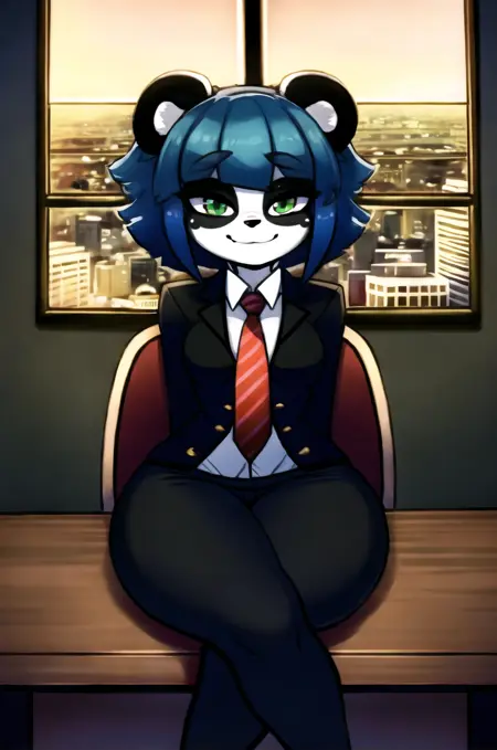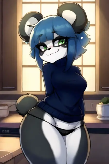 V1.5b prompts : furry, (black and white fur), 1girl, masterpiece, best quality, animal nose, gold hearts, eye makeup, Nuwa Nightstone, green eyes, blue hair, (panda girl), panda ears
