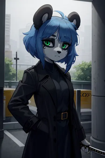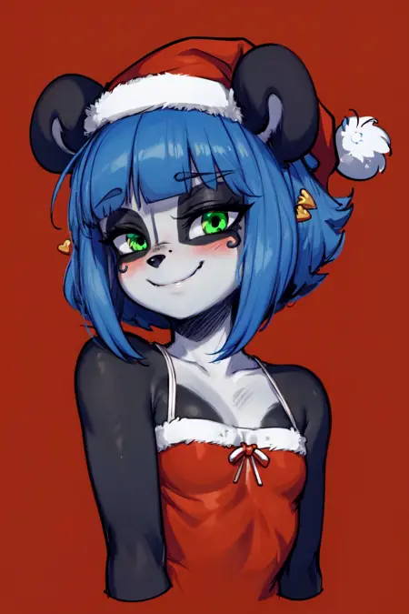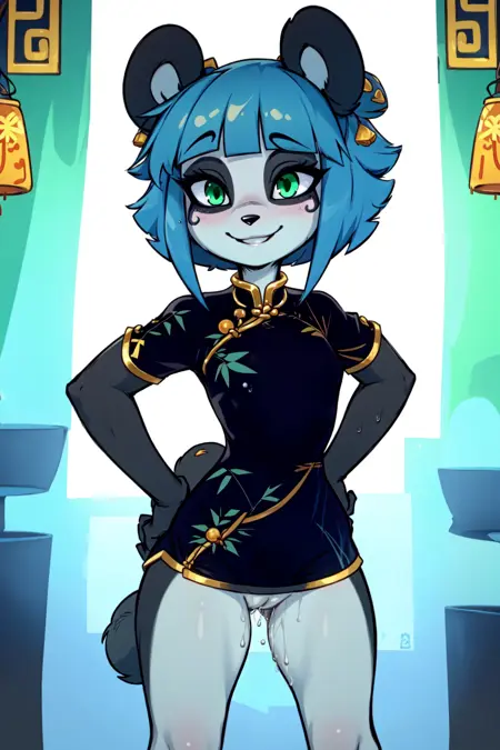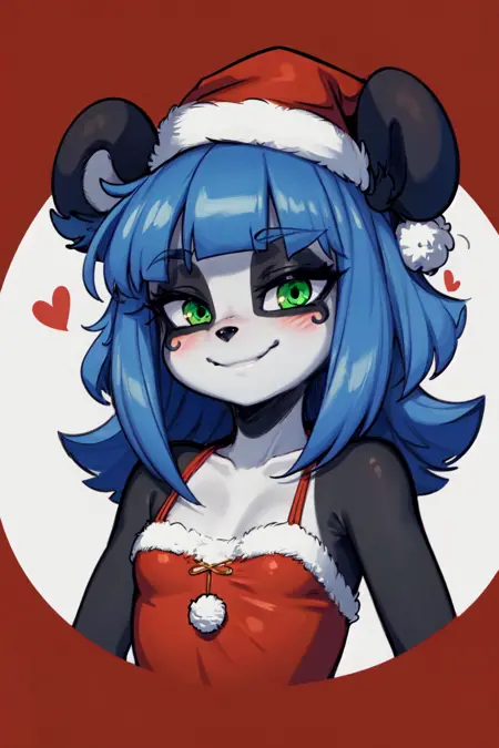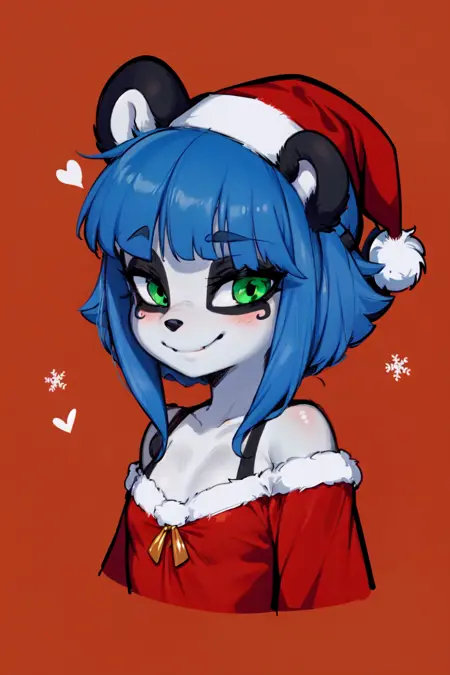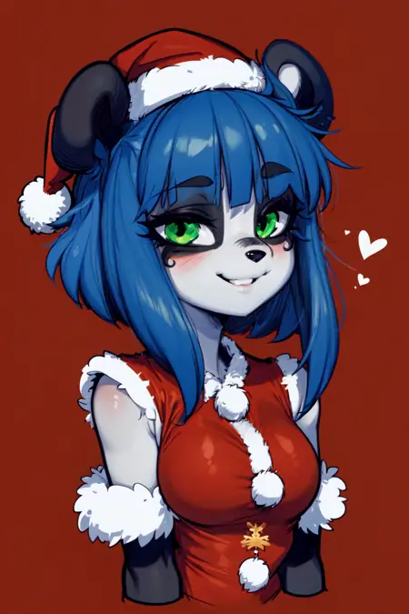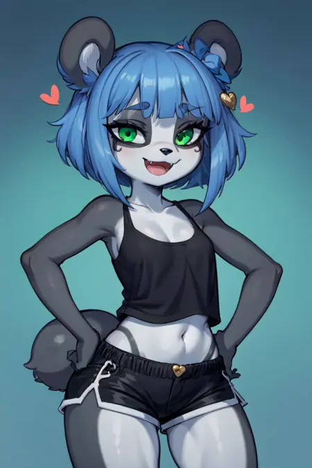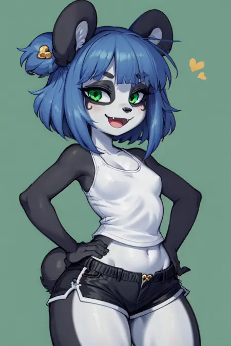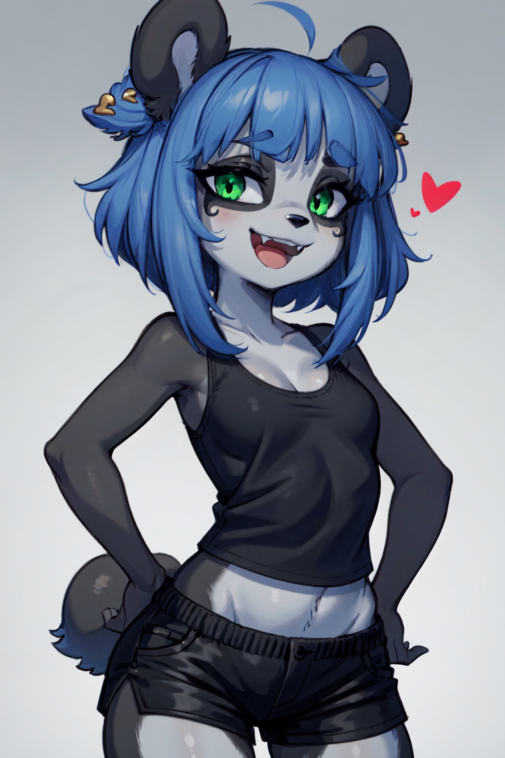 V1.5b prompts : furry, (black and white fur), 1girl, masterpiece, best quality, animal nose, gold hearts, eye makeup, Nuwa Nightstone, green eyes, blue hair, (panda girl), panda ears