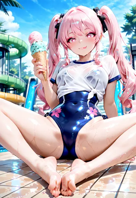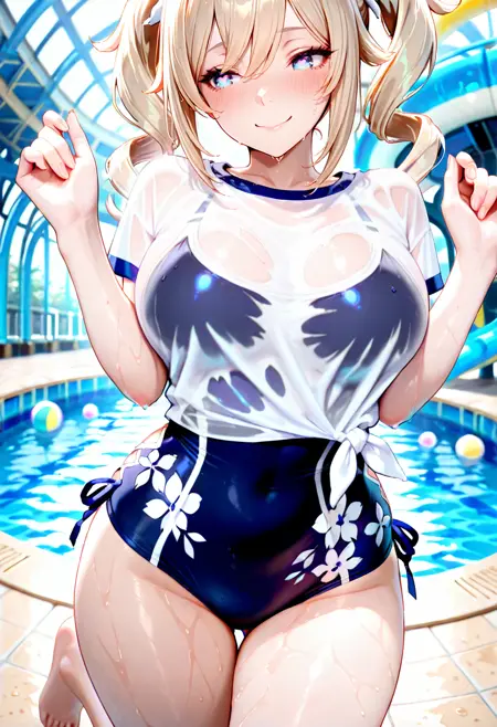 - 泳装,蓝色连体泳装,衣服下的泳装,侧系衬衫,透明,赤脚,花卉图案,湿衬衫,白衬衫,