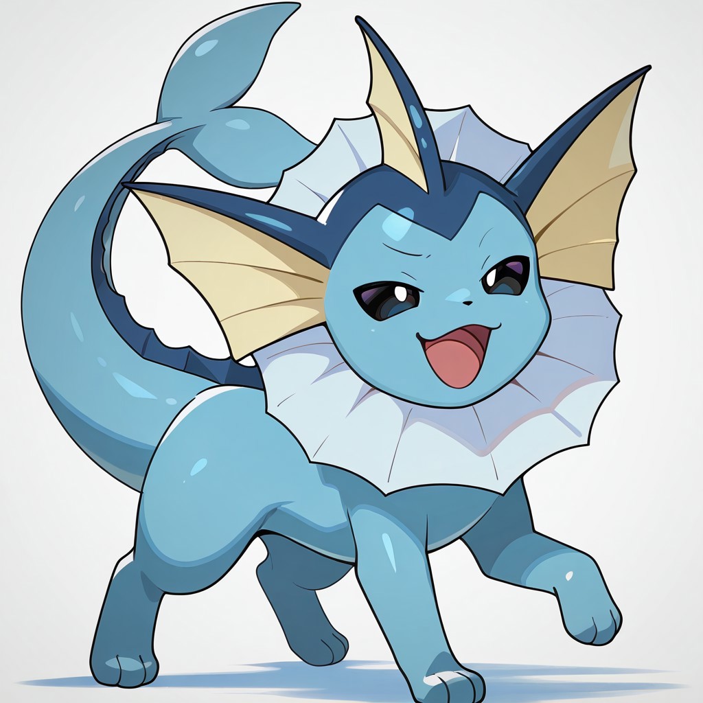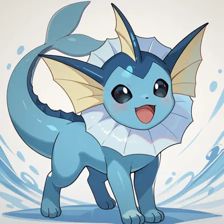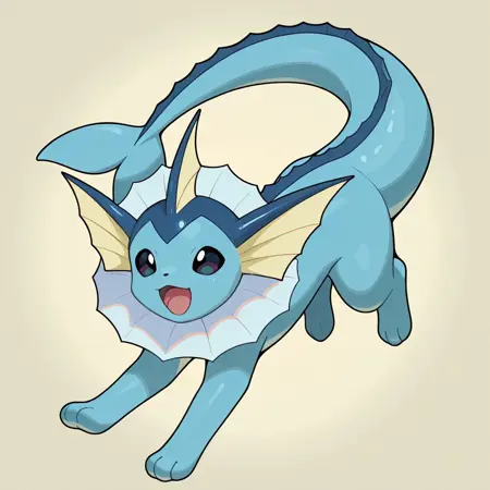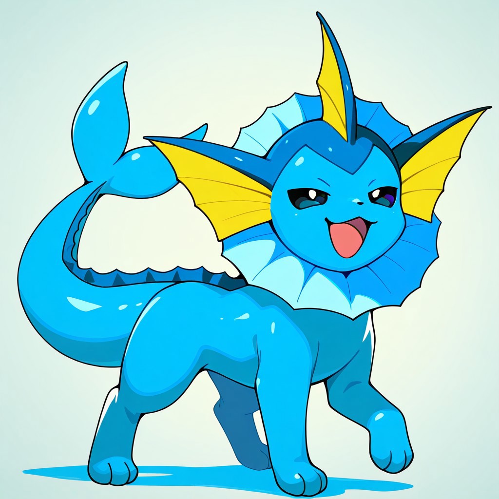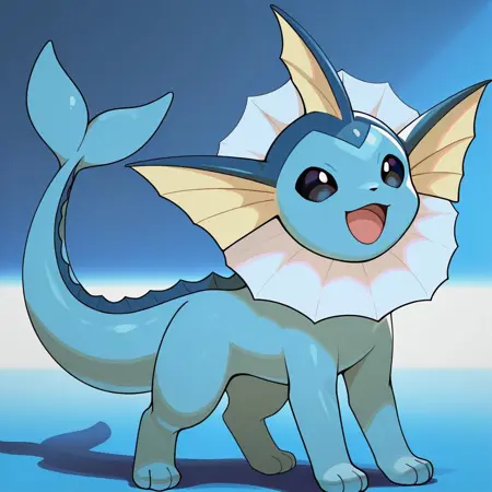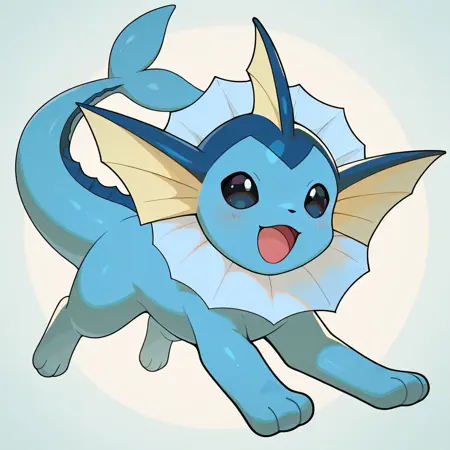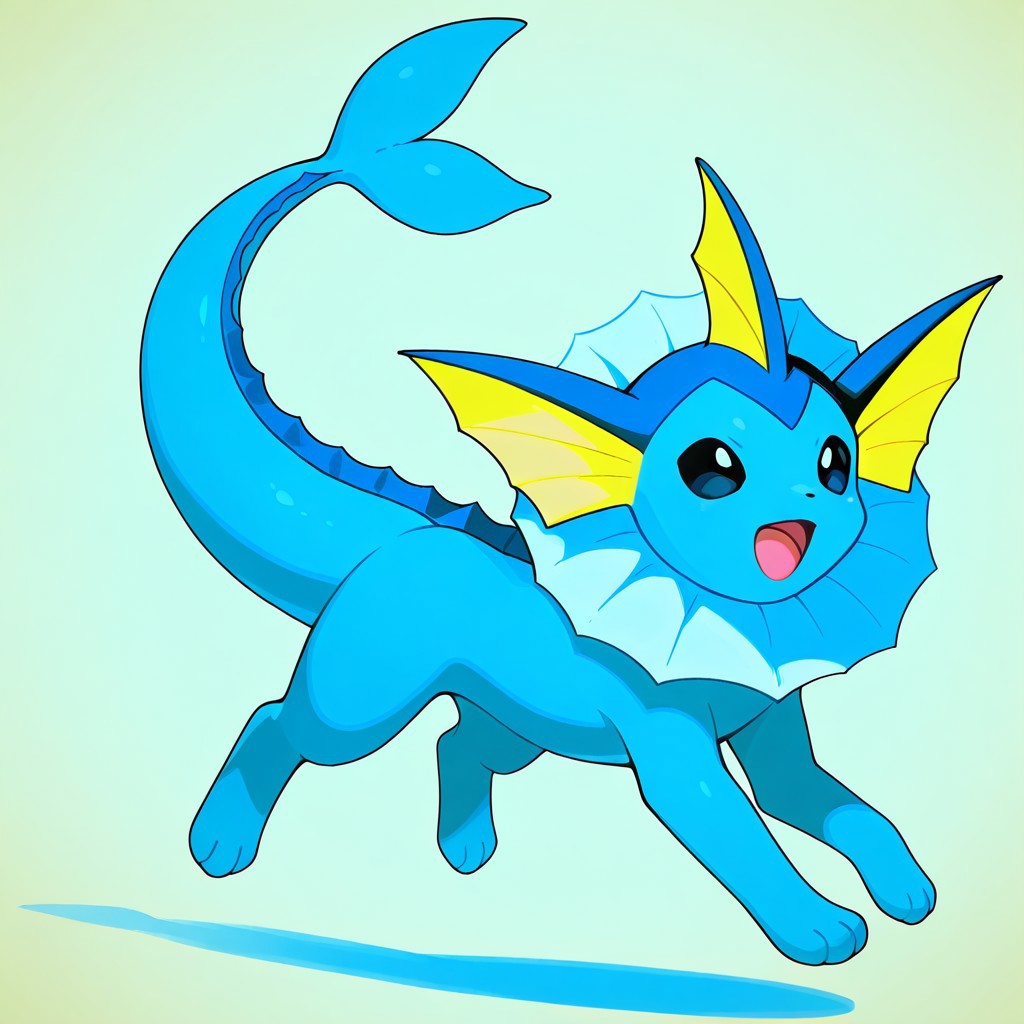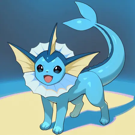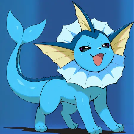 vaporeon, pokemon (creature), blue fur, dark blue ridge on back, light yellow ears, quadruped, black eyes, long tail, whale tail,
