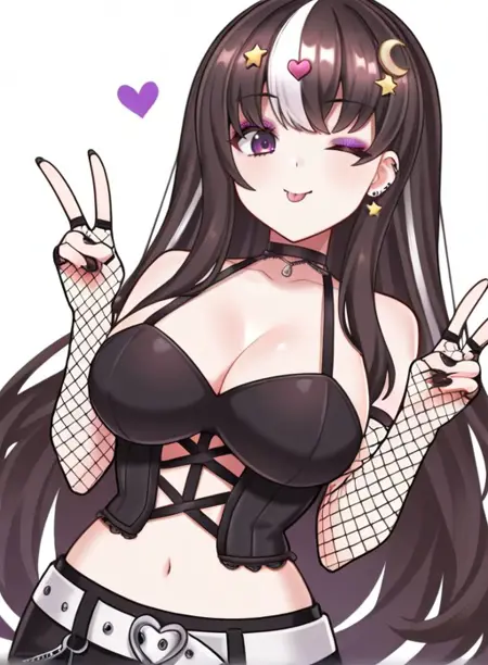 Jazminvt, brown hair, long hair, breasts, large breasts, black hair, hair ornament, purple eyes, white hair, multicolored hair, heart, earrings, choker, virtual youtuber, nail polish, star (symbol), streaked hair, black nails, eyeshadow, star hair ornament, heart hair ornament, crescent hair ornament, goth fashion, very long hair, black choker, makeup, piercing,
