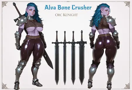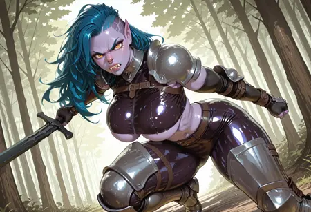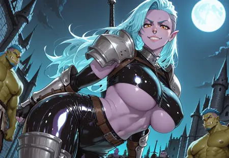 권장 프롬프트: 보라색 피부, 뾰족한 귀, 검은색 머리, 긴 머리, 언더컷, 주근깨, 주황색 눈, 두꺼운 입술, 윤기 나는 입술, 오르크 코, 코 고리, 오르크 송곳니, 큰 가슴