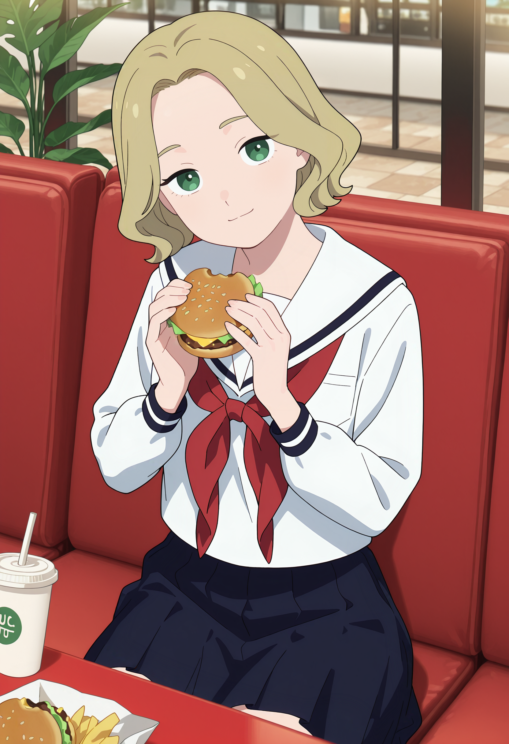 YanoMei, green eyes, blonde hair, short hair, curtained hair