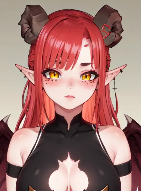 Niika_Sauria, 1girl, solo, long hair, breasts, large breasts, medium breasts, yellow eyes, ponytail, red hair, horns, , glasses, pointy ears,strapless, tattoo, makeup, demon girl, demon horns, black nails, slit pupils, eyeshadow, long fingernails, round eyewear,pink lips, sharp fingernails, scales, curled horns, yellow-framed eyewear, eyelashes, lipstick, red nails, earrings,