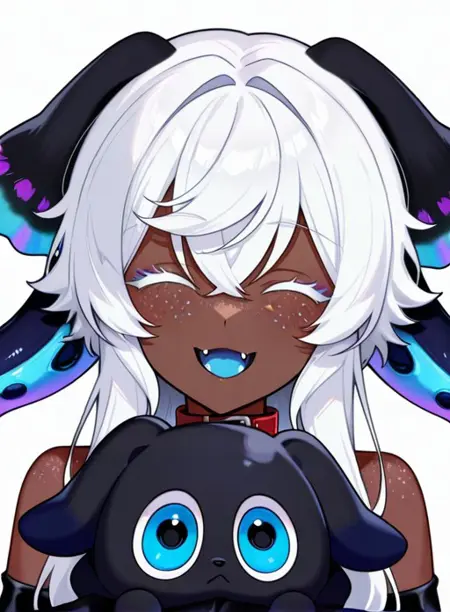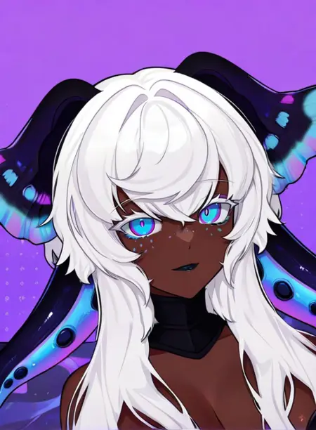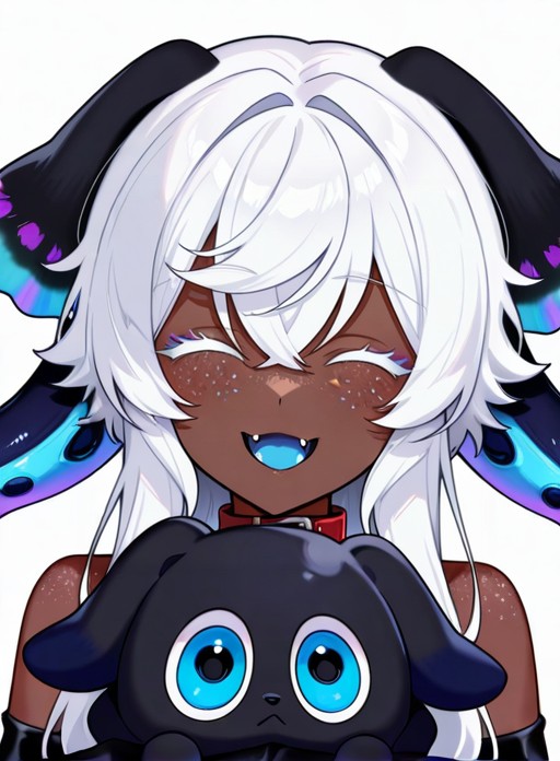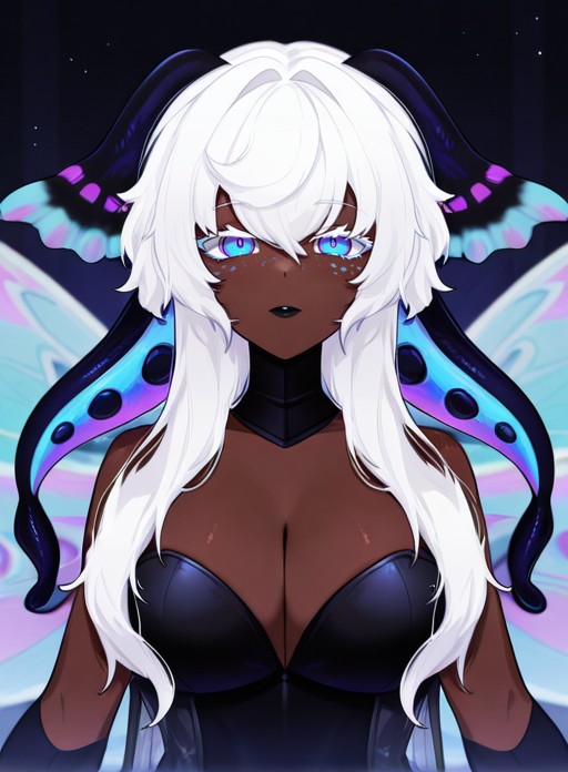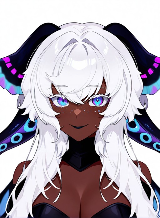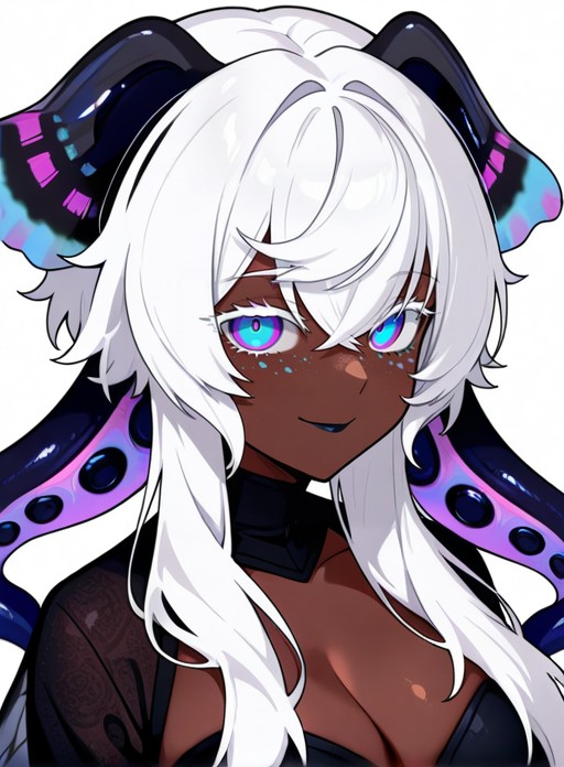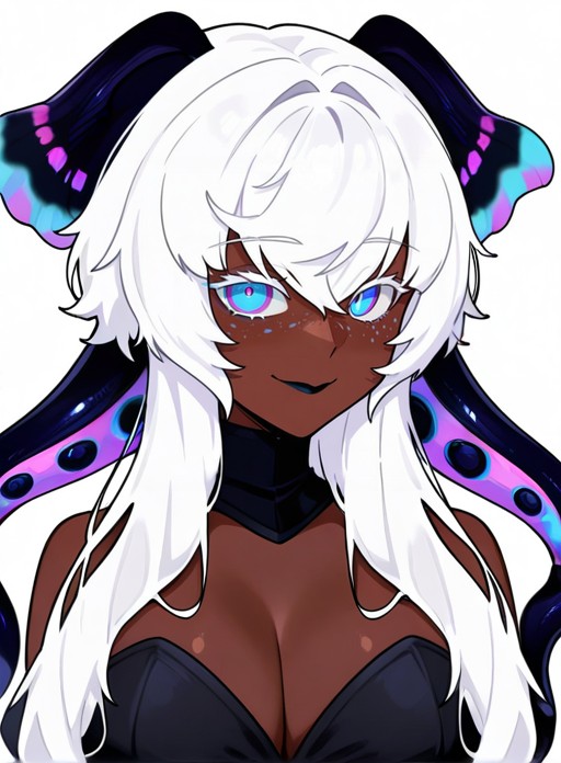 Serrivel, long hair, breasts, blue eyes, large breasts, hair between eyes, cleavage, purple eyes, white hair, dark skin, dark-skinned female, makeup, monster girl, head wings, tentacles, freckles, multicolored eyes, colored eyelashes, tentacle hair, black collar, extra eyes, very dark skin, horizontal pupils, black lips, colored tongue, pink pupils, blue pupils, scylla, purple pupils, horns, virtual youtuber, colored skin, insect wings