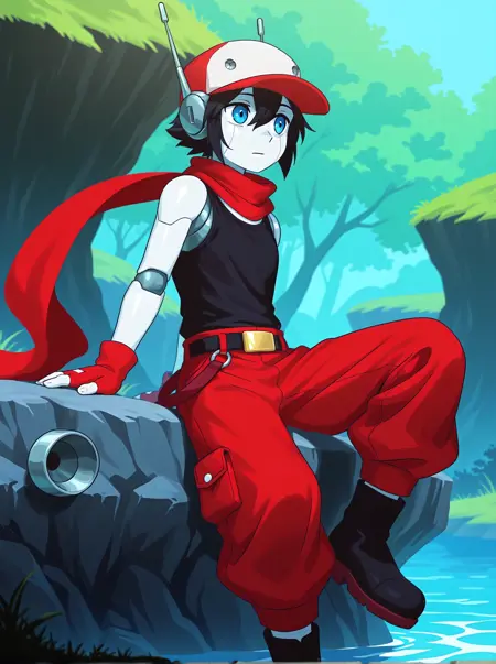 red hat, metal hat, baseball cap, green scarf, red gloves, black tank top, red pants, cargo pants, black belt, gold buckle, black shoes,