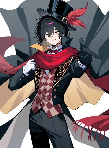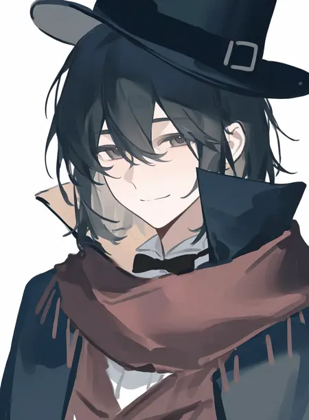 scarf,top hat,vest,black jacket,long sleeves,white shirt,