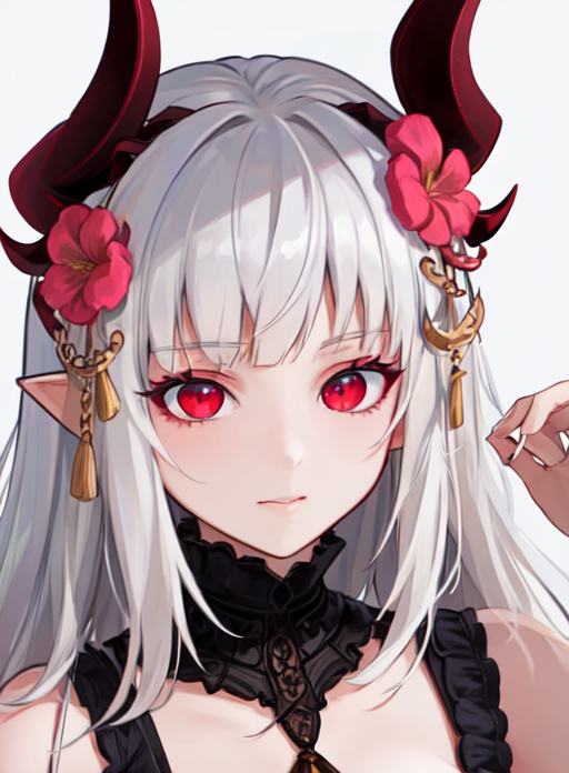 shionrosenthal, horns, hair flower, pointy ears, red eyes, white hair