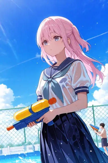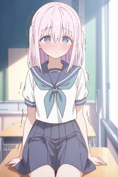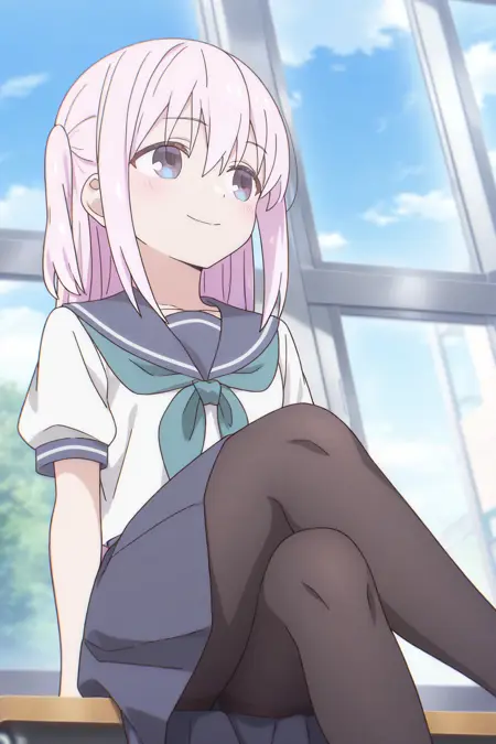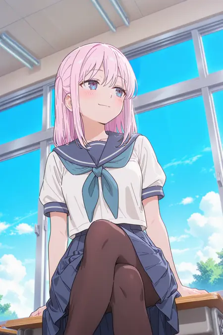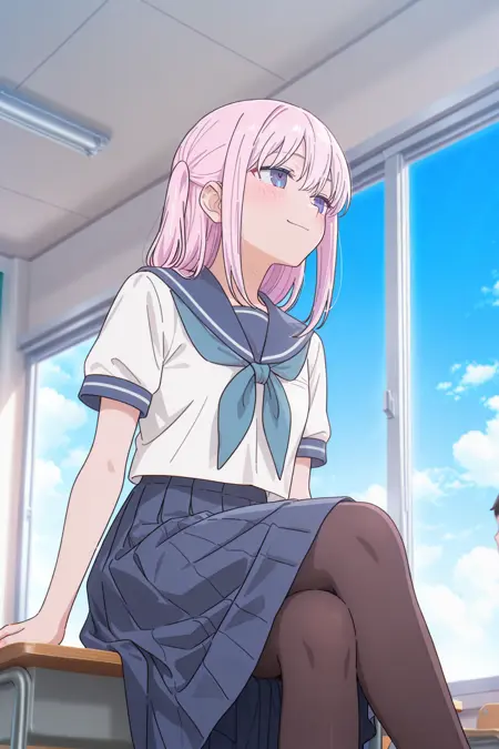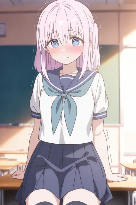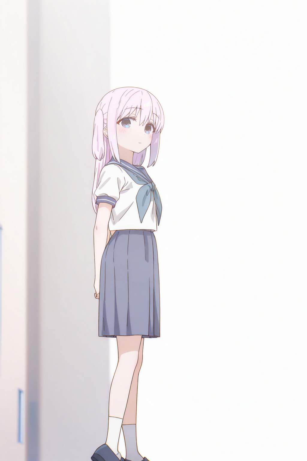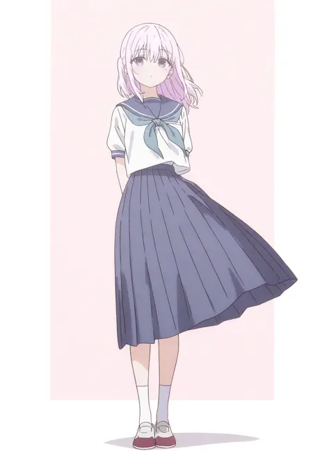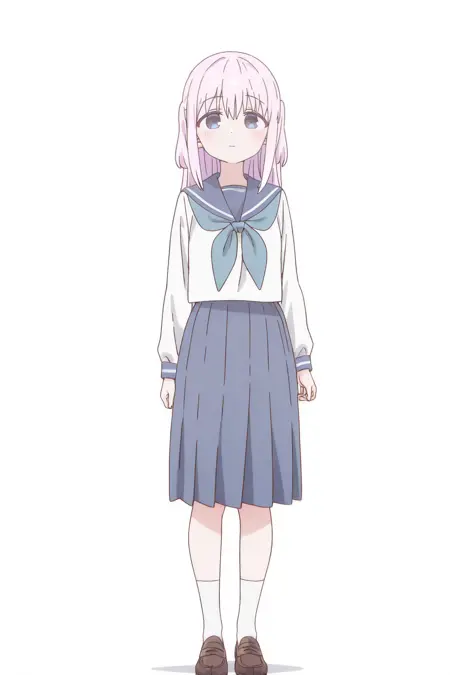 school uniform or serafuku, blue neckerchief, blue sailor collar, uniform, blue skirt, medium skirt, pleated skirt, white socks