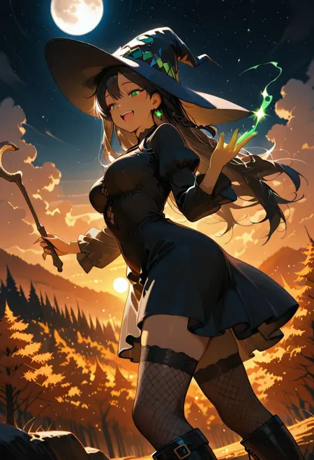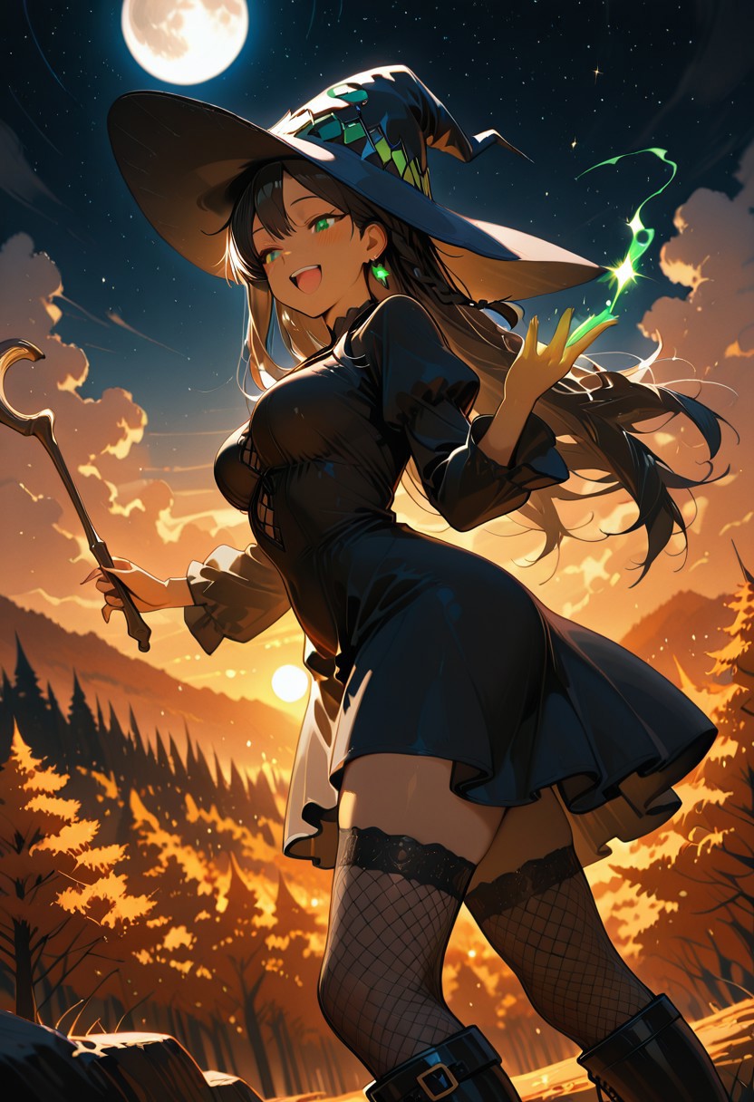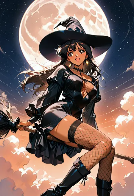 Tags Ex: short Black Witch Dress, Long Sleeve puffy shoulder dress, black witch hat, earrings, Fishnet stockings, black knee boots,, sitting on a broomstick, flying on a magic broomstick, legs bent, flying in a starry night sky,